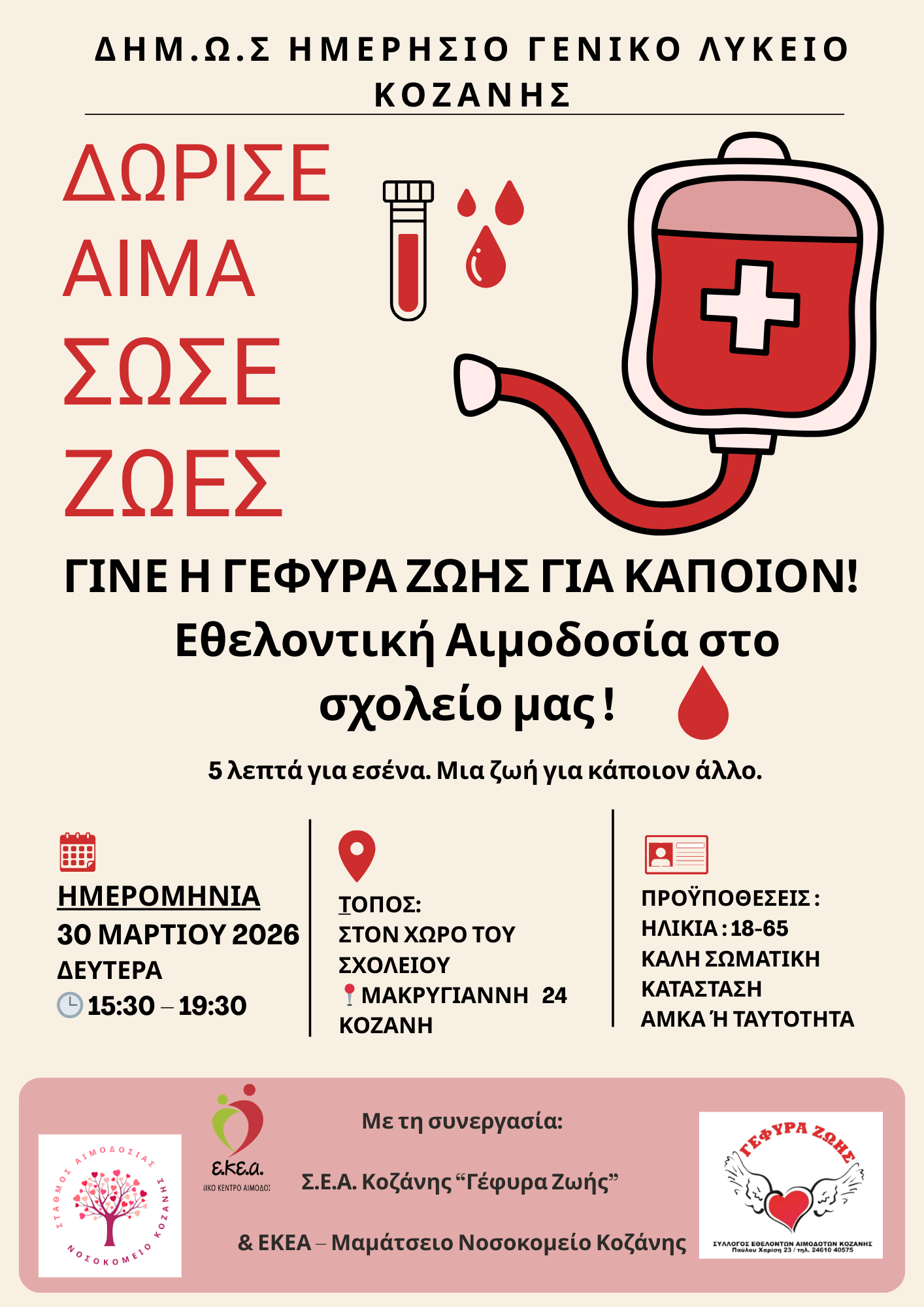 Με ιδιαίτερη χαρά στηρίζουμε την αξιέπαινη πρωτοβουλία των μαθητών του ΔΗΜ.Ω.Σ. ΓΕΛ Κοζάνης, οι οποίοι ανέλαβαν εξ ολοκλήρου τη διοργάνωση της εθελοντικής αιμοδοσίας, από την ιδέα μέχρι και τη δημιουργία της αφίσας, αποδεικνύοντας πως η νέα γενιά εμπνέει και προσφέρει.