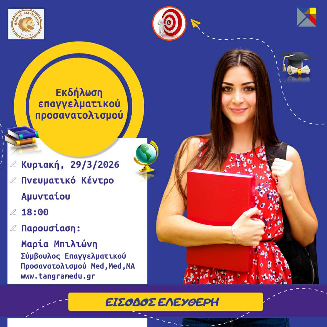 Ο Δήμος Αμυνταίου σας προσκαλεί στην εκδήλωση επαγγελματικού προσανατολισμού, η οποία θα πραγματοποιηθεί την Κυριακή 29 Μαρτίου 2026, στις 18:00, στο Πνευματικό Κέντρο Αμυνταίου.