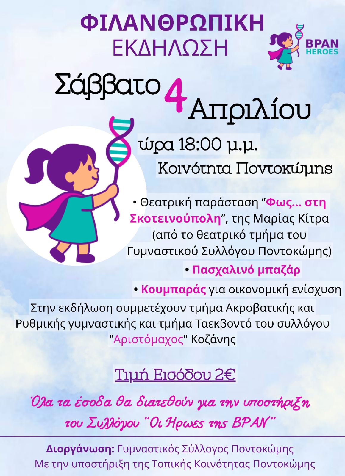 Ο Γυμναστικός Σύλλογος Ποντοκώμης σας προσκαλεί σε μια ξεχωριστή φιλανθρωπική εκδήλωση, που διοργανώνει για τον Σύλλογο “Οι Ήρωες της BPAN“, με στόχο να στηρίξουμε όλοι μαζί τον σκοπό του συλλόγου.