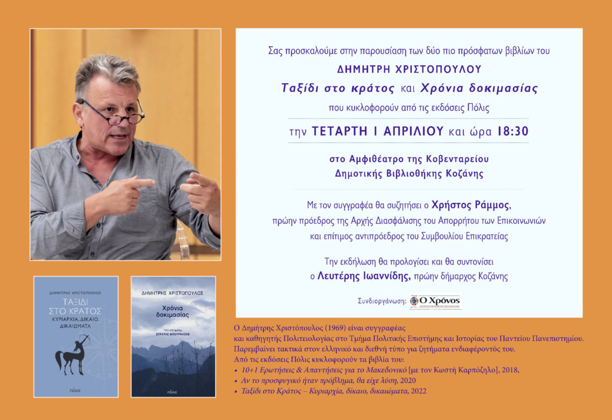 Σας προσκαλούμε στην παρουσίαση των δύο πρόσφατων βιβλίων του Δημήτρη Χριστόπουλου, «Ταξίδι στο κράτος» και «Χρόνια δοκιμασίας», που κυκλοφορούν από τις εκδόσεις Πόλις. Η εκδήλωση θα πραγματοποιηθεί την Τετάρτη 1 Απριλίου 2026 και ώρα 18:30, στο Αμφιθέατρο της Δημοτικής Βιβλιοθήκης Κοζάνης. Με τον συγγραφέα θα συζητήσει ο Χρήστος Ράμμος, πρώην πρόεδρος της Αρχής Διασφάλισης του Απορρήτου των Επικοινωνιών και επίτιμος αντιπρόεδρος του Συμβουλίου της Επικρατείας.