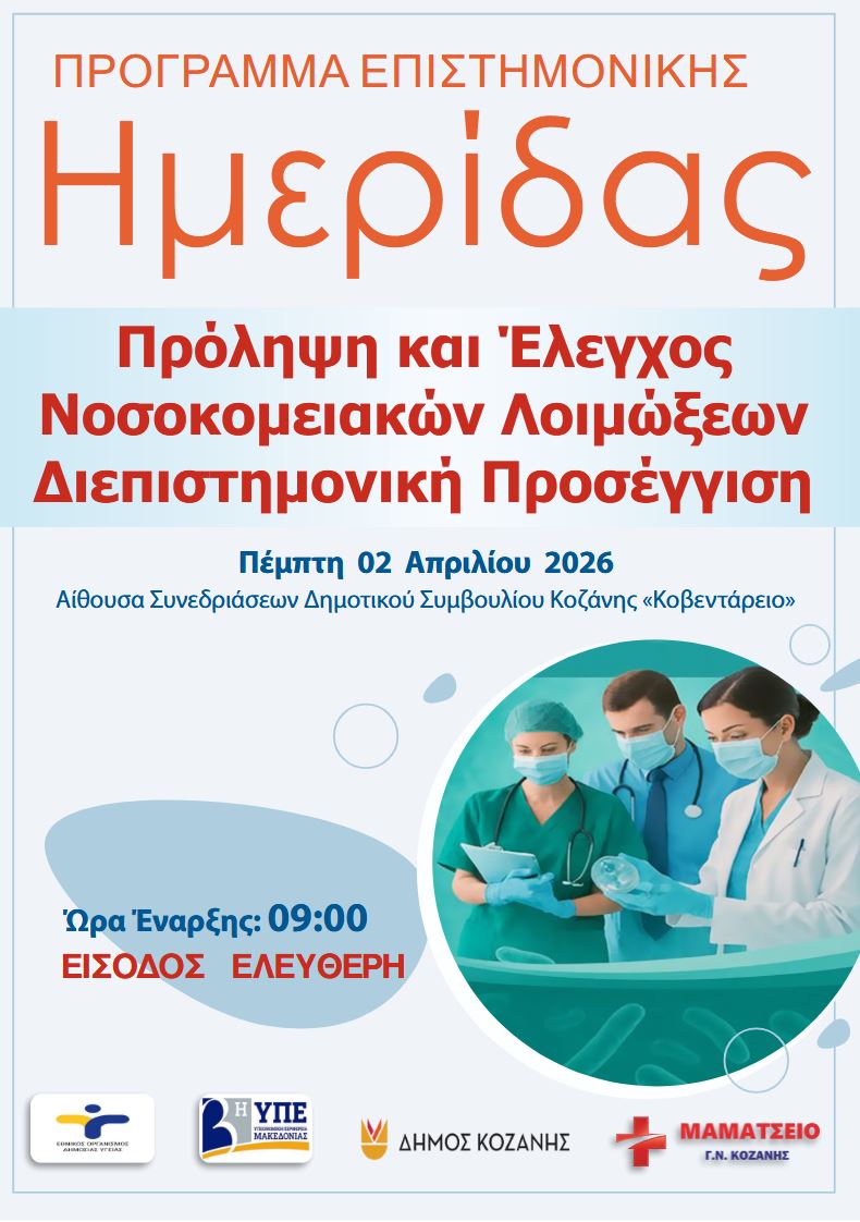 Πρόληψη και Έλεγχος Νοσοκομειακών Λοιμώξεων Διεπιστημονική Προσέγγιση. Πέμπτη 02 Απριλίου 2026 Αίθουσα Συνεδριάσεων Δημοτικού Συμβουλίου Κοζάνης «Κοβεντάρειο». ‘Ωρα Έναρξης: 09:00 ΕΙΣΟΔΟΣ ΕΛΕΥΘΕΡΗ