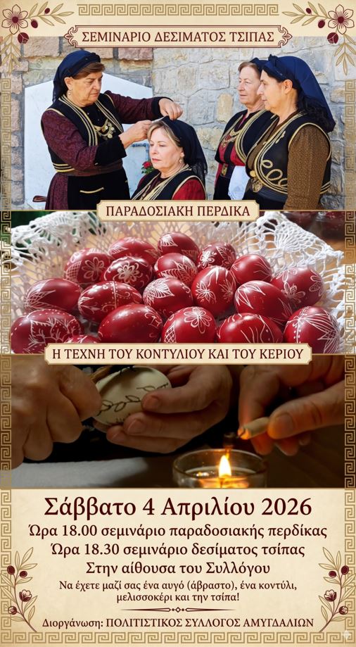 Ο Πολιτιστικός Σύλλογος Αμυγδαλιών σας προσκαλεί σε μια ξεχωριστή συνάντηση αφιερωμένη στα έθιμα και την παράδοση του τόπου μας. Ελάτε να μάθουμε μαζί την τέχνη της “περδίκας” και το παραδοσιακό δέσιμο της τσίπας.