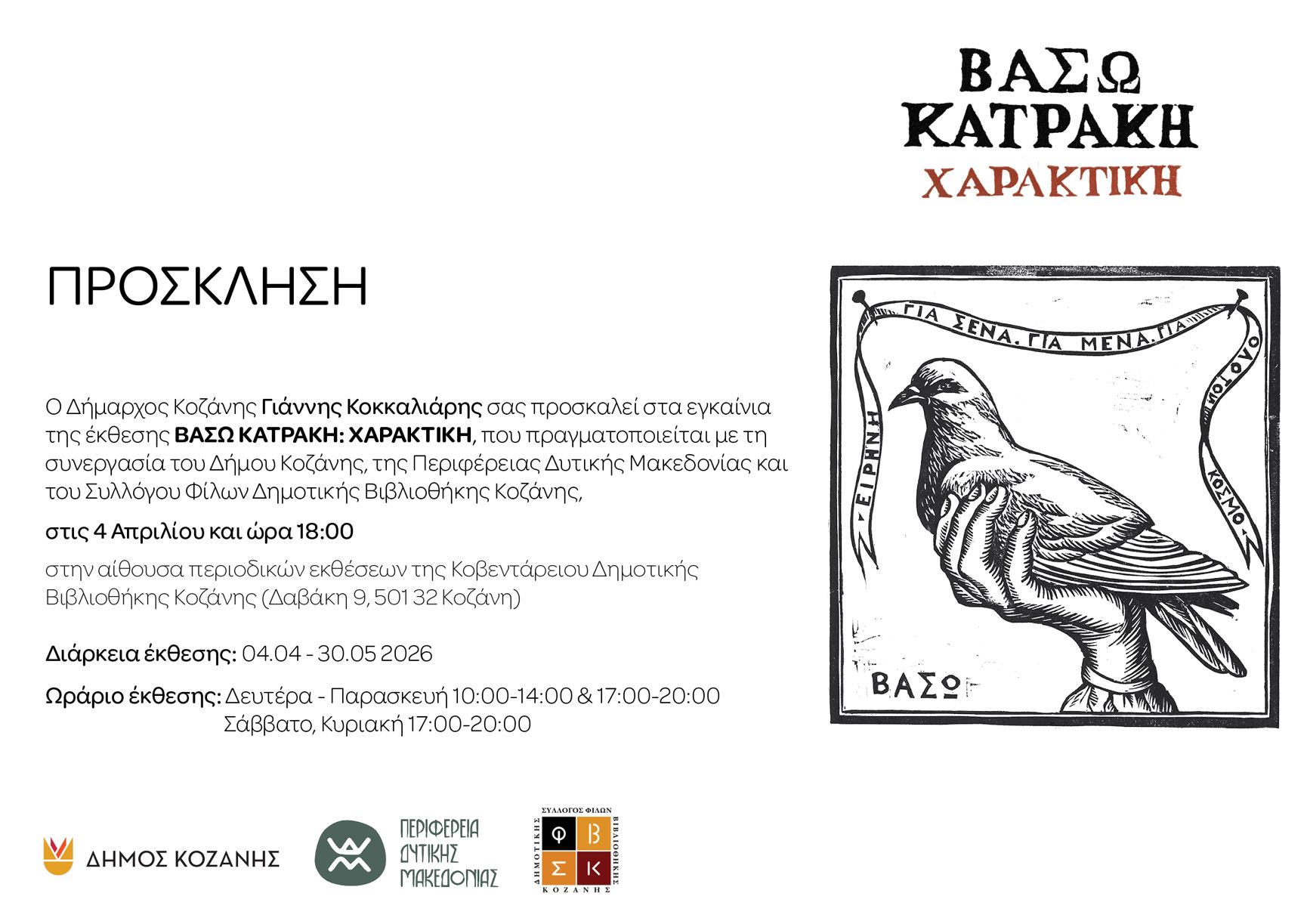 Η ΚΟΒΕΝΤΑΡΕΙΟΣ ΔΗΜΟΤΙΚΗ ΒΙΒΛΙΟΘΗΚΗ ΚΟΖΑΝΗΣ, ο σημαντικότερος φορέας πολιτισμού της πόλης, με ιδιαίτερη χαρά και τιμή παρουσιάζει την έκθεση «Βάσω Κατράκη: Χαρακτική» (4 Απριλίου – 30 Μαΐου 2026), την πρώτη αναδρομική έκθεση της σπουδαίας Ελληνίδας χαράκτριας στην Κοζάνη και γενικότερα στη Δυτική Μακεδονία. Η έκθεση φιλοδοξεί να φέρει σε επαφή το φιλότεχνο κοινό της Περιφέρειας της Δυτικής Μακεδονίας με το έργο μιας σπουδαίας δημιουργού, που άφησε ανεξίτηλο αποτύπωμα στη χαρακτική τέχνη.