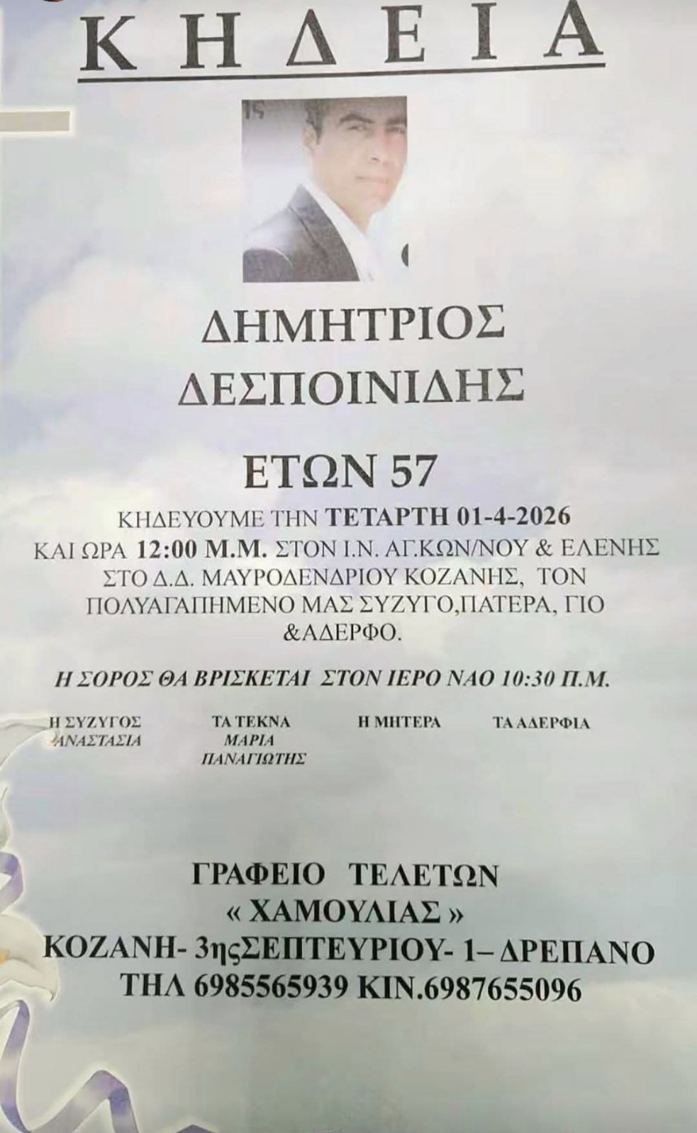 Έφυγε από την ζωή, σε ηλικία 57 ετών, ο Δημήτρης Δεσποινίδης. Υπήρξε δύο φόρες υποψήφιος βουλευτής με το κόμμα των ΑΝΕΛ στην Κοζάνη, μετέπειτα με το κόμμα της “Ελληνικής Λύσης” του Κυριάκου Βελόπουλου το 2019 στην Κοζάνη και το 2023 στην Λάρισα, ενώ είχε θέσει υποψηφιότητα και στο στίβο της αυτοδιοίκησης ως υποψήφιος περιφερειακός σύμβουλος με τον Θ. Καρυπίδη και υποψήφιος Πρόεδρος στην Λυγερή. Θερμά συλλυπητήρια στην οικογένειά του.