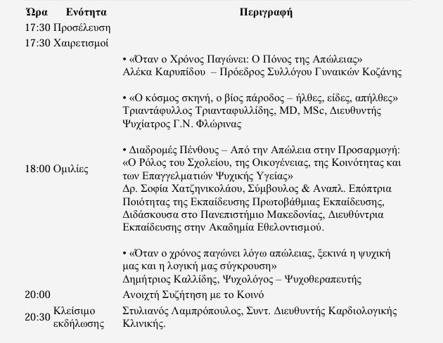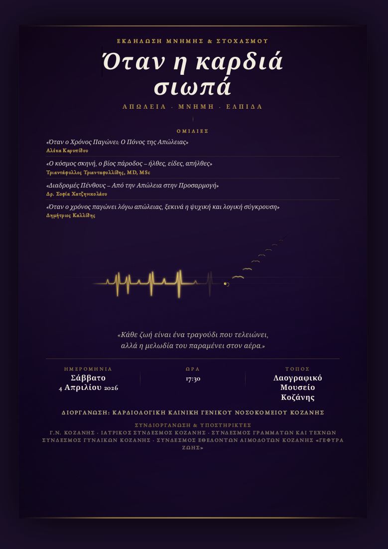 Η Καρδιολογική Κλινική του Γενικού Νοσοκομείου Κοζάνης σας προσκαλεί στην εκδήλωση: «Όταν η Καρδιά Σιωπά: Υποστήριξη Οικογενειών στη Διαχείριση της Απώλειας», που θα πραγματοποιηθεί το Σάββατο 4 Απριλίου 2026, στις 17:30, στο Λαογραφικό Μουσείο Κοζάνης. Μια βραδιά αφιερωμένη στην κατανόηση του πένθους, τη στήριξη των οικογενειών και τη δύναμη της κοινότητας. Μια εκδήλωση που ενώνει επιστήμη, τέχνη και ανθρώπινη εμπειρία, με στόχο τη στήριξη, την κατανόηση και την ελπίδα. Η παρουσία σας θα μας τιμήσει ιδιαίτερα.