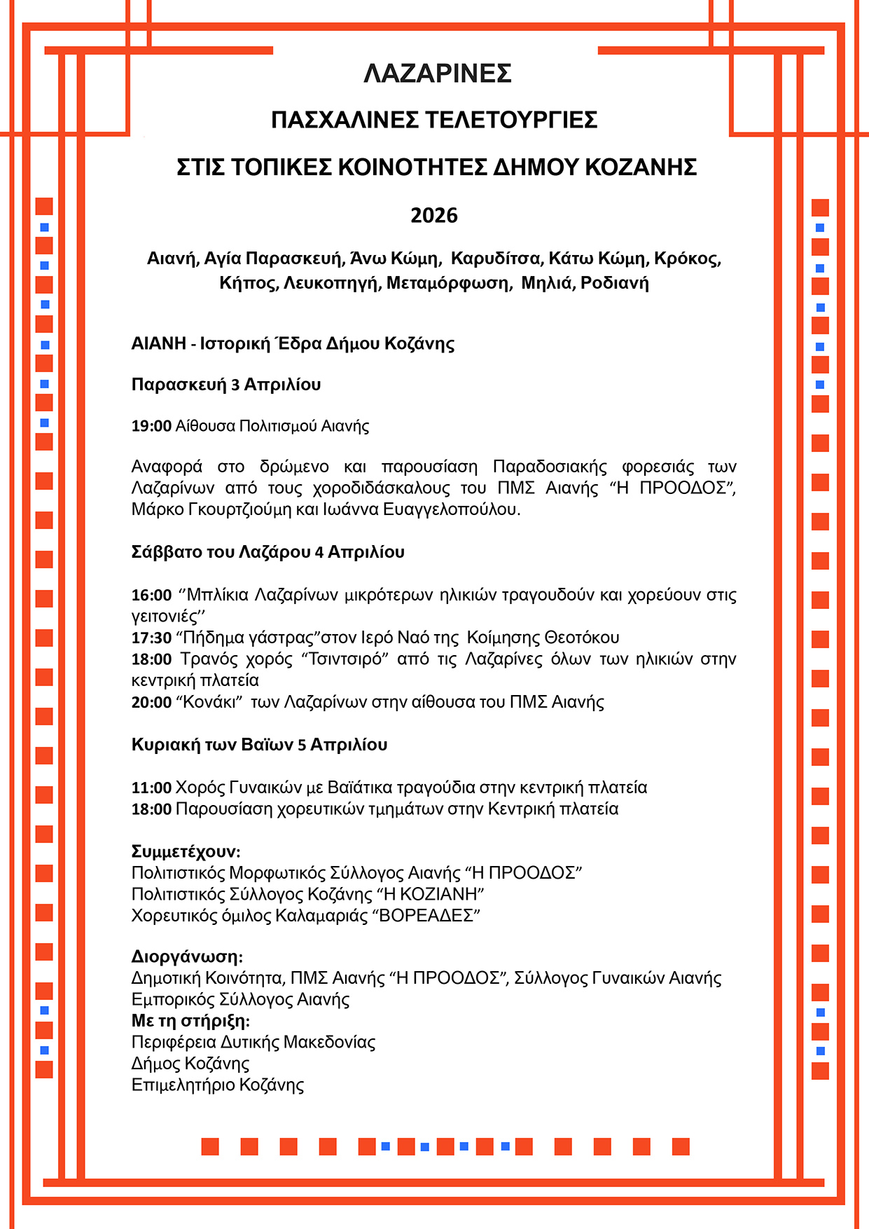 18:00 Τρανός χορός “Τσιντσιρό” από τις Λαζαρίνες όλων των ηλικιών στην κεντρική πλατεία