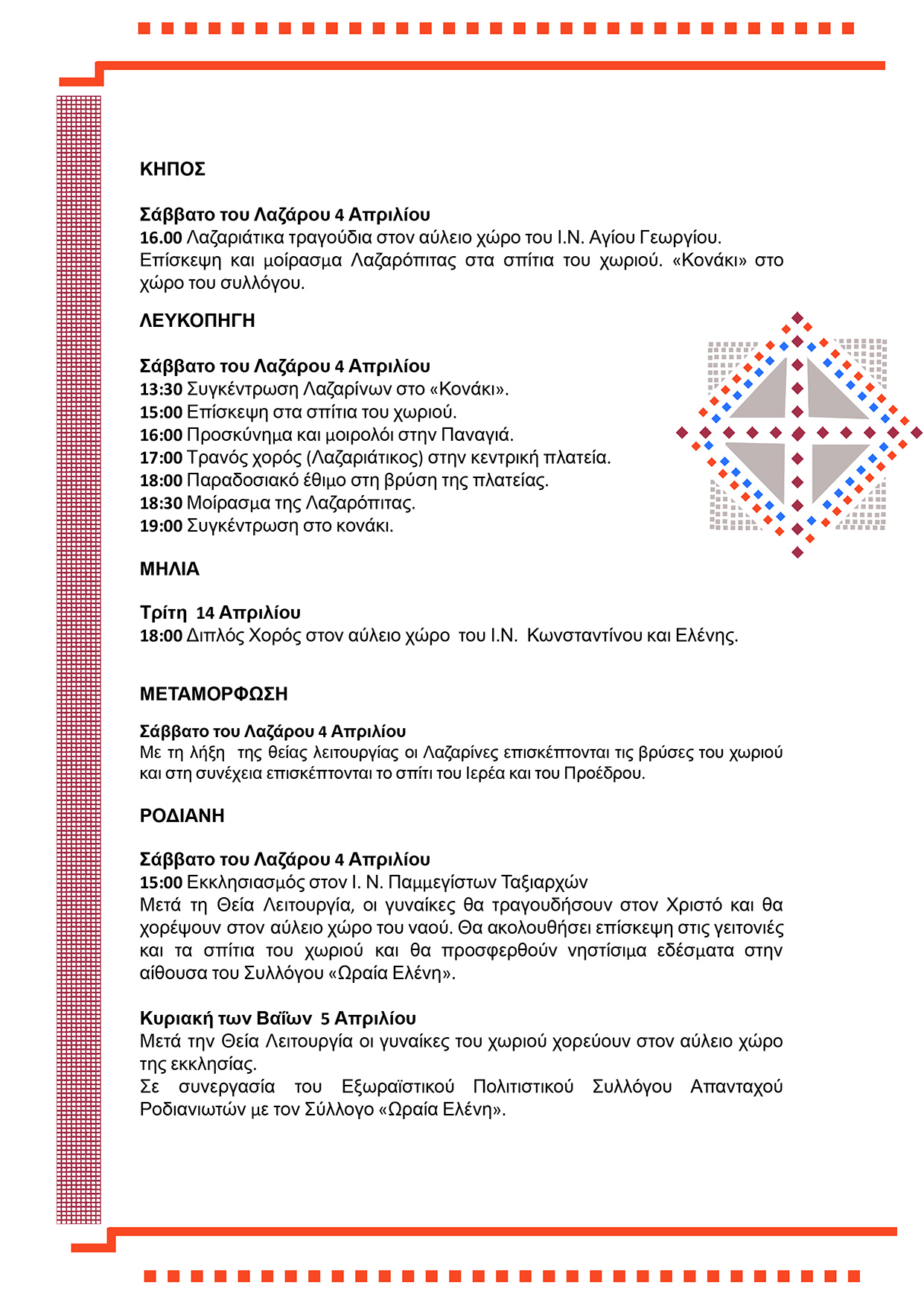 17:00 Τρανός χορός (Λαζαριάτικος) στην κεντρική πλατεία.