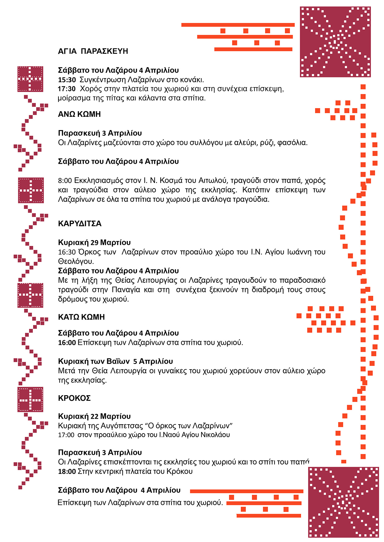 16:00 Επίσκεψη των Λαζαρίνων στα σπίτια του χωριού.