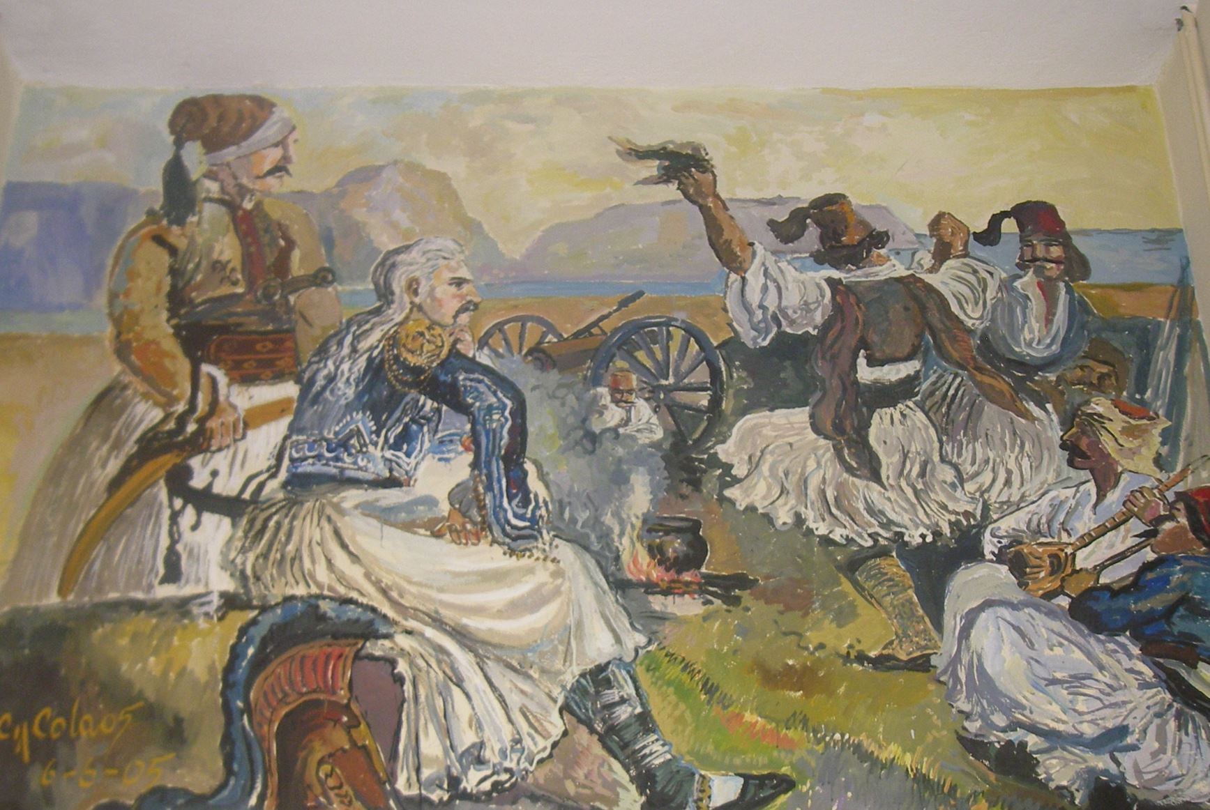 Ο Γέρος του Μωριά επιβλέπει το χορό των αγωνιστών.Έργο Γιώργου Κόλα (6-6-2005) στο 5ο Δημοτικό Σχολείο Κοζάνης