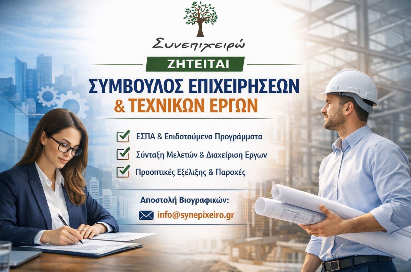 Η επιχείρηση «Συνεπιχειρώ Ε.Ε.», με έδρα την Κοζάνη και δυναμική παρουσία στον τομέα των επενδυτικών σχεδίων, της συμβουλευτικής επιχειρήσεων και της διαχείρισης τεχνικών έργων, αναζητά νέο συνεργάτη για ενίσχυση της ομάδας της με σύμβαση πλήρους απασχόλησης.
