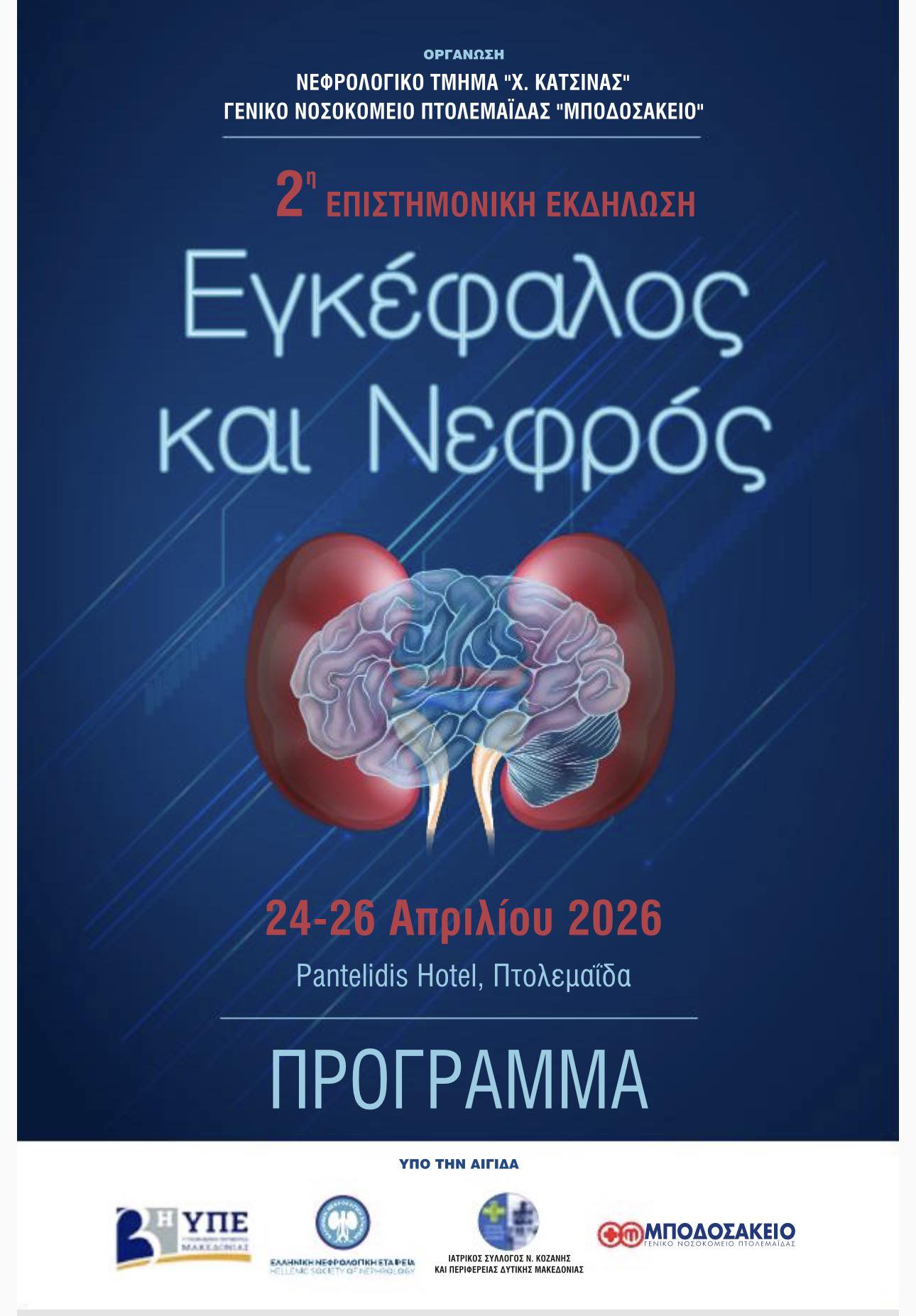 2η Επιστημονική Εκδήλωση με θέμα «Εγκέφαλος και Νεφρός», που θα πραγματοποιηθεί στις 24–26 Απριλίου 2026 στο Pantelidis Hotel στην φιλόξενη πόλη της Πτολεμαΐδας.
