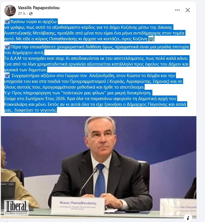 Σχολιάζοντας την απόφαση του αναπληρωτή υπουργού Εθνικής Οικονομίας και Οικονομικών Νίκου Παπαθανάση για ένταξη στο Ειδικό Πρόγραμμα Δίκαιης Αναπτυξιακής Μετάβασης του Εθνικού Προγράμματος Ανάπτυξης (ΕΠΑ) 2021-2025 της ανάπλασης κοινόχρηστων χώρων στον δήμο Κοζάνης με το ποσό των 4.609.142 ευρώ, ο Αντιδήμαρχος Β. Παπαποστόλου σχολίασε: “Βγαίνω τώρα κι αρχίζω να γράφω, πως αυτό το αξιοθαύμαστο κέρδος για το Δήμο Κοζάνης μέσω της Δίκαιης Αναπτυξιακής Μετάβασης, προήλθε από μένα που είμαι ένα μήνα αντιδήμαρχος στον τομέα αυτό. Με είδε ο κύριος Παπαθανάσης κι άρχισε να κοιτάζει…προς Κοζάνη. Πέρα την οποιαδήποτε χιουμοριστική διάθεση όμως, πραγματικά είναι μια μεγάλη επιτυχία του Δημάρχου αυτή.