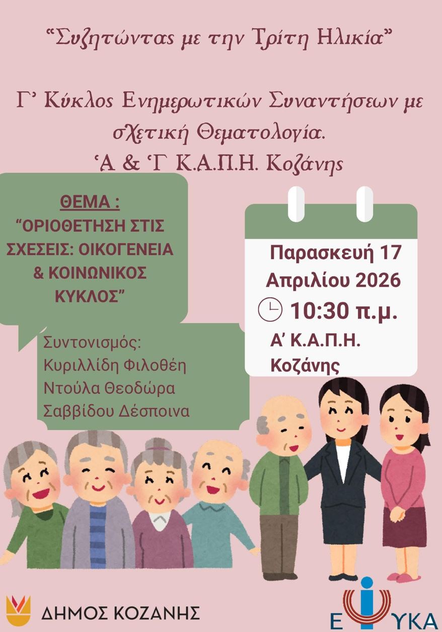 Το 1ο ΚΑΠΗ του Δήμου Κοζάνης στην οδό Φον Κοζάνη & Γρανικού, σας προσκαλεί στην ενημερωτική εκδήλωση με θέμα «Οριοθέτηση στις σχέσεις: Οικογένεια και κοινωνικός κύκλος», η οποία θα πραγματοποιηθεί την Παρασκευή 17 Απριλίου 2026 και ώρα 10:30 το πρωί, με ελεύθερη είσοδο.