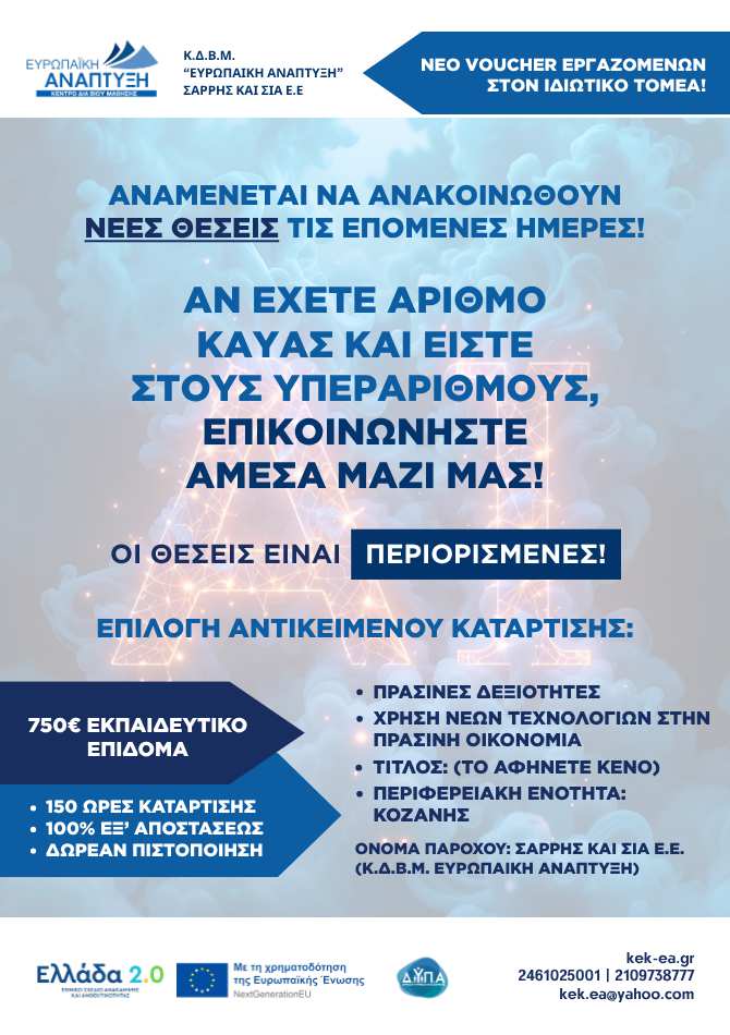 Αναμένεται να ανακοινωθούν νέες θέσεις τις επόμενες ημέρες! Ενημερωθείτε εγκαίρως για να προχωρήσετε άμεσα στην επιλογή θεματικού – Εξασφαλίστε την κατάρτισή σας και το επίδομα των 750€ στο Κ.Δ.Β.Μ «Ευρωπαϊκή Ανάπτυξη» ΣΑΡΡΗΣ ΚΑΙ ΣΙΑ ΕΕ.