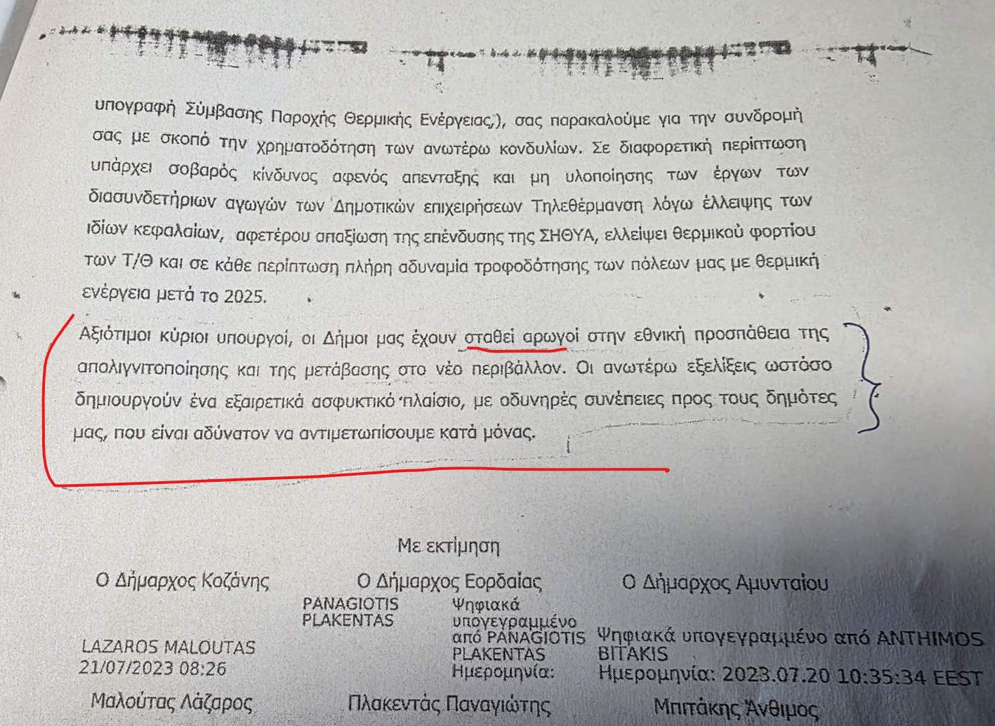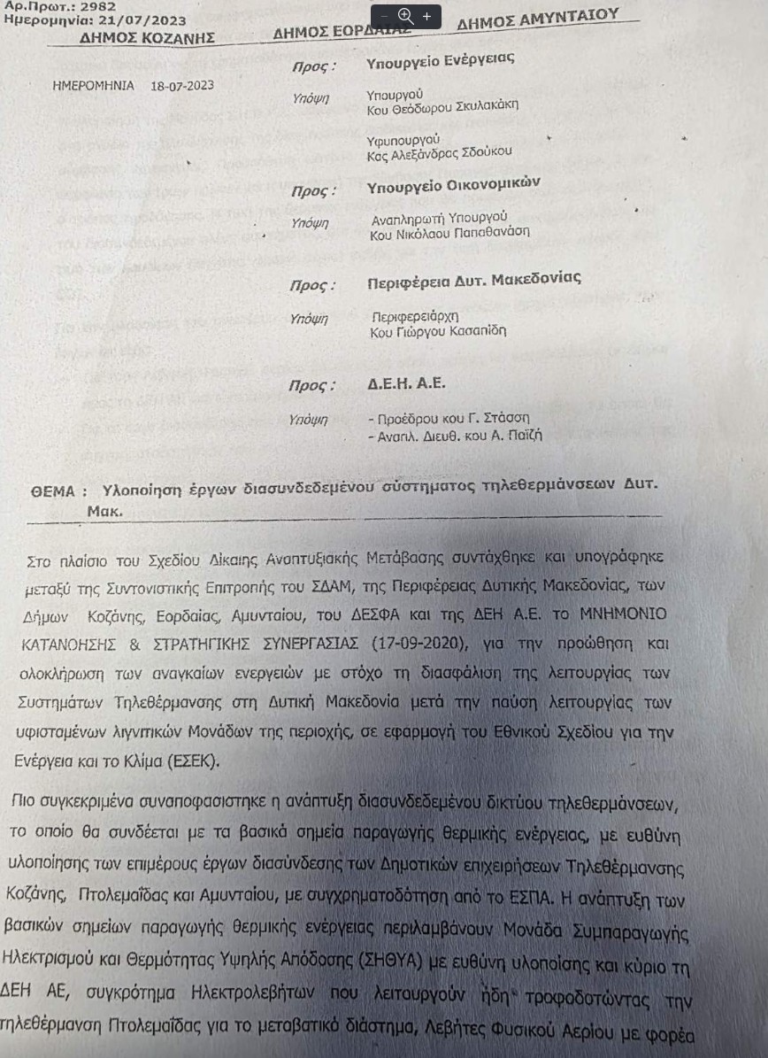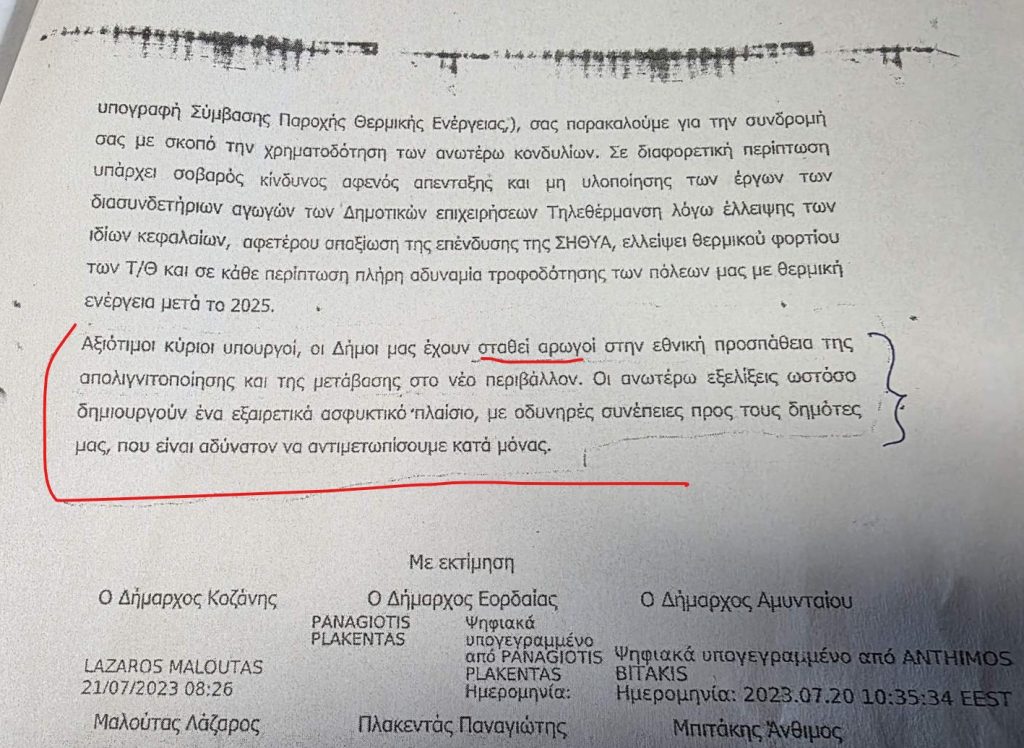 Σ’ ένα έγγραφο του 2023, το οποίο – όπως είπε – έχουν υπογράψει, την περασμένη αυτοδοικητική περίοδο, δήμαρχοι της περιοχής, ανάμεσά τους και ο Δήμαρχος Εορδαίας, Παναγιώτης Πλακεντάς, αναφέρθηκε, με συνέντευξή του στο kozan.gr, το πρωί της Πέμπτης 16/4, ο Πέτρος Ταταρίδης, υποστηρίζοντας ότι αποτελεί «καταφανέστατη ομολογία» στήριξης της πολιτικής της απολιγνιτοποίησης. Ο επικεφαλής της Λαϊκής Συσπείρωσης ανέφερε πως στο συγκεκριμένο κείμενο γίνεται λόγος για δήμους που «στάθηκαν αρωγοί στην εθνική προσπάθεια της απολιγνιτοποίησης και της μετάβασης στο νέο περιβάλλον». Κατά τον ίδιο, η συγκεκριμένη διατύπωση δεν είναι μια απλή τυπική αναφορά, αλλά πολιτική παραδοχή. Όπως είπε, η δημοτική αρχή όχι μόνο δεν έβαλε εμπόδια στην πορεία αυτή, αλλά κινήθηκε με αποφάσεις και στάσεις που διευκόλυναν την εφαρμογή της.