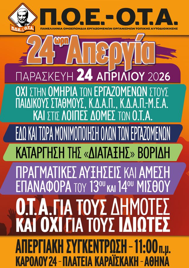Κατά τη συνεδρίαση αποφασίστηκε ομόφωνα η συμμετοχή στην 24ωρη πανελλαδική απεργία της ΠΟΕ-ΟΤΑ που θα πραγματοποιηθεί την Παρασκευή 24 Απριλίου 2026, καθώς και η μετάβαση στην Αθήνα για τη συμμετοχή στο συλλαλητήριο και την πορεία της ΠΟΕ-ΟΤΑ.