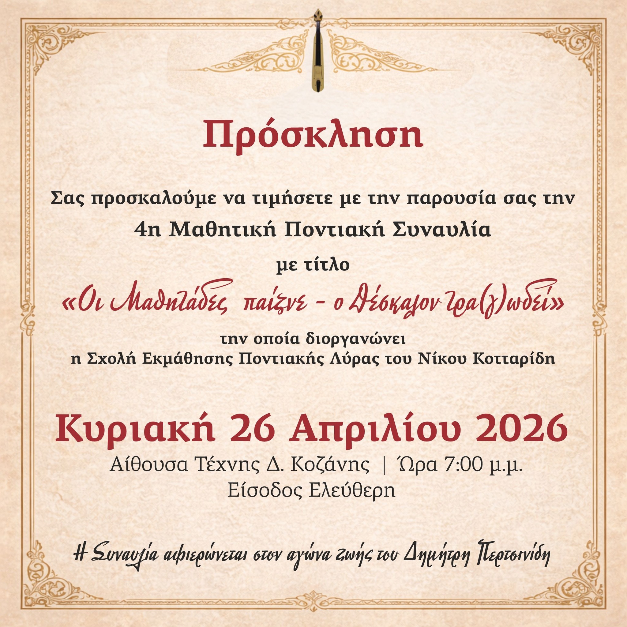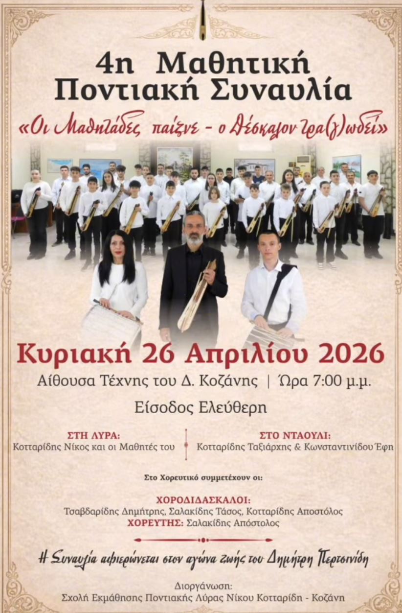 4η Μαθητική Ποντιακή Συναυλία την Κυριακή 26 Απριλίου στην Αίθουσα Τέχνης του Δήμου Κοζάνης