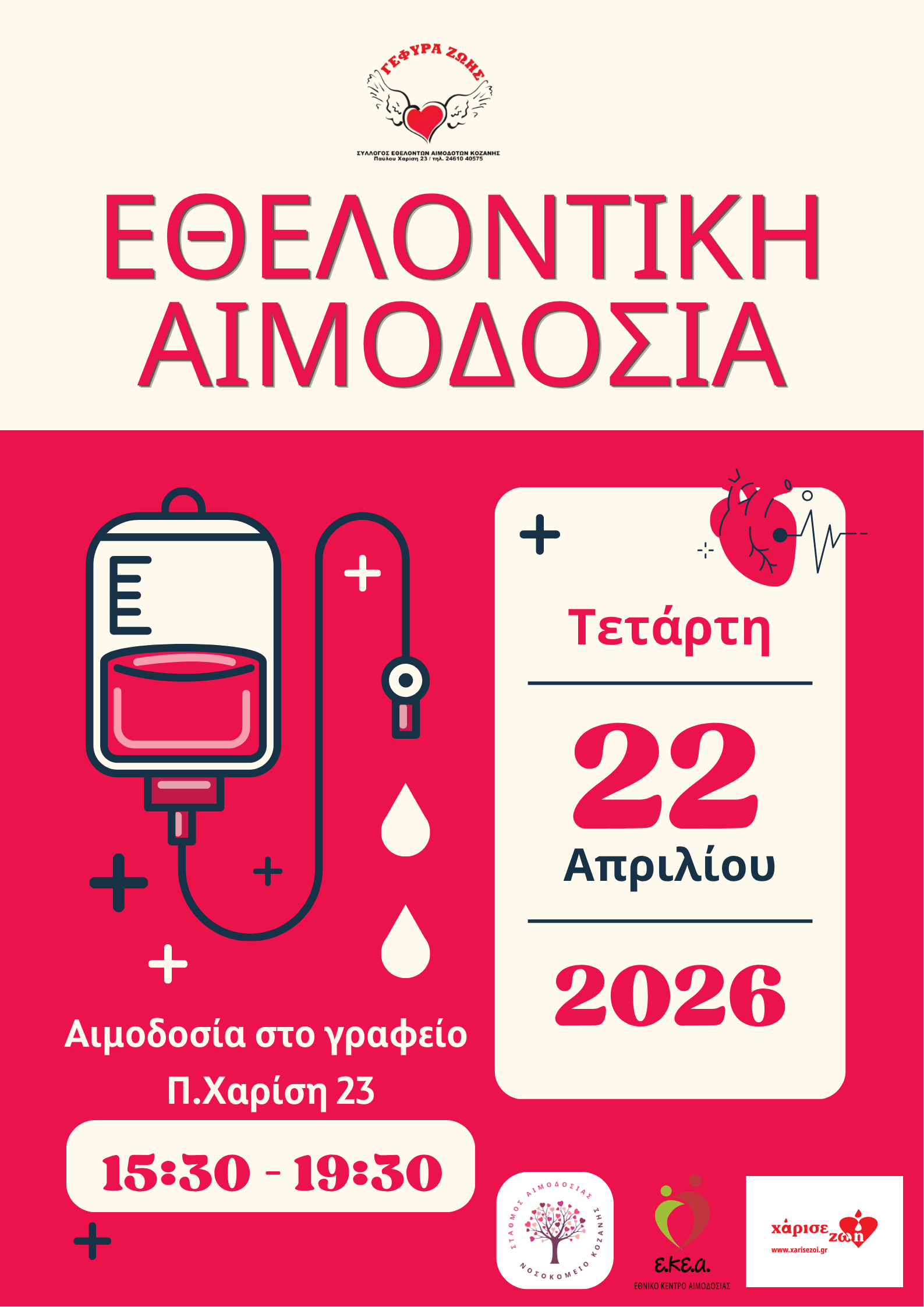 Την Τετάρτη 22 Απριλίου 2026, από τις 15:30 έως τις 19:30, στο γραφείο του συλλόγου μας (Π. Χαρίση 23), δίνουμε όλοι μαζί ένα ραντεβού ζωής.