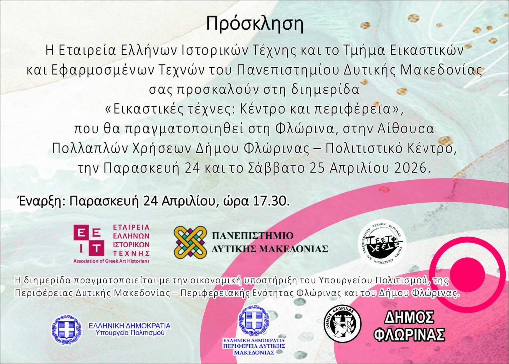 Η Εταιρεία Ελλήνων Ιστορικών Τέχνης και το Τμήμα Εικαστικών και Εφαρμοσμένων Τεχνών, της Σχολής Καλών Τεχνών του Πανεπιστημίου Δυτικής Μακεδονίας με την οικονομική υποστήριξη του Υπουργείου Πολιτισμού, της Περιφέρειας Δυτικής Μακεδονίας – Περιφερειακής Ενότητας Φλώρινας και του Δήμου Φλώρινας διοργανώνουν τη διημερίδα «Εικαστικές τέχνες: Κέντρο και περιφέρεια», που θα πραγματοποιηθεί στη Φλώρινα, στην Αίθουσα Πολλαπλών Χρήσεων Δήμου Φλώρινας – Πολιτιστικό Κέντρο, την Παρασκευή 24 και το Σάββατο 25 Απριλίου 2026.