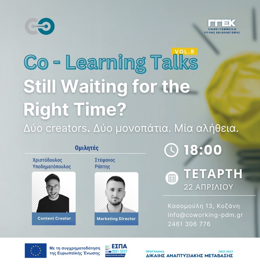 Ο Συνεργατικός Χώρος Εργασίας Δυτικής Μακεδονίας ( Κασομούλη 13, Κοζάνη ) προσκαλεί το κοινό στο 8ο Co-learning Talks, που θα πραγματοποιηθεί την Τετάρτη 22 Απριλίου 2026, 18:00–20:00, στην Κοζάνη. Η εκδήλωση απευθύνεται σε επαγγελματίες, δημιουργούς, φοιτητές και κάθε ενδιαφερόμενο που θέλει να εξελίξει την παρουσία του στο ψηφιακό περιβάλλον. Η συμμετοχή είναι δωρεάν.
