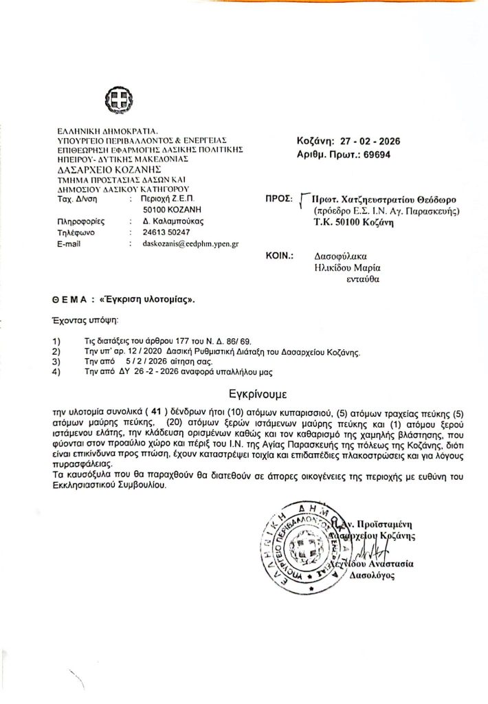 Κατόπιν του υπ. αριθμ. 69694/27-2-2026 εγγράφου του Δασαρχείου Κοζάνης εγκρίθηκε η υλοτομία 41 δένδρων, μεταξύ αυτών και αρκετών ξερών, για λόγους δημιουργίας πυροπροστασίας κατά τους θερινούς μήνες και προστασίας της στατικότητας των παρακειμένων κτιρίων, όπως η νομοθεσία προβλέπει. Το έγγραφο παρατίθεται συνημμένως, για την πιστοποίηση της νομιμότητας των πραγμάτων. Πρόθεση του Εκκλησιαστικού Συμβουλίου του Ιερού Ναού Αγίας Παρασκευής πόλεως Κοζάνης δεν είναι η καταπάτηση του πρασίνου, αλλά η ανάπλαση του χώρου, η προάσπιση του ήδη υπάρχοντος πράσινου που ενδεχομένως κινδύνευε από τυχόν πυρκαγιές, καθώς και η διάνθησή του εκεί που δεν θα προκαλεί πρόβλημα (μεταξύ αυτών και με τοποθέτηση καλλωπιστικών δένδρων), γιατί δεν υπάρχει πιο αληθινή οικολογική συνείδηση από αυτήν της Ορθοδόξου Εκκλησίας.