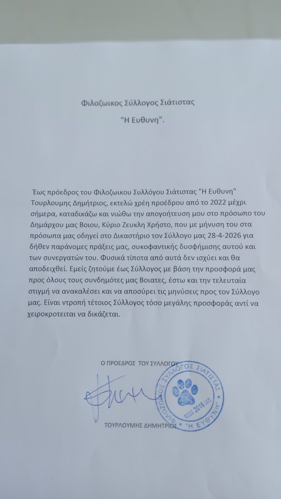 Ανακοίνωση εξέδωσε ο Φιλοζωικός Σύλλογος Σιάτιστας «Η Ευθύνη», μέσω του προέδρου του Δημήτρη Τουρλούμη, σχετικά με δικαστική υπόθεση που αφορά μήνυση από τον Δήμαρχο Βοΐου, Χρήστο Ζευκλή, σε βάρος μελών του συλλόγου.