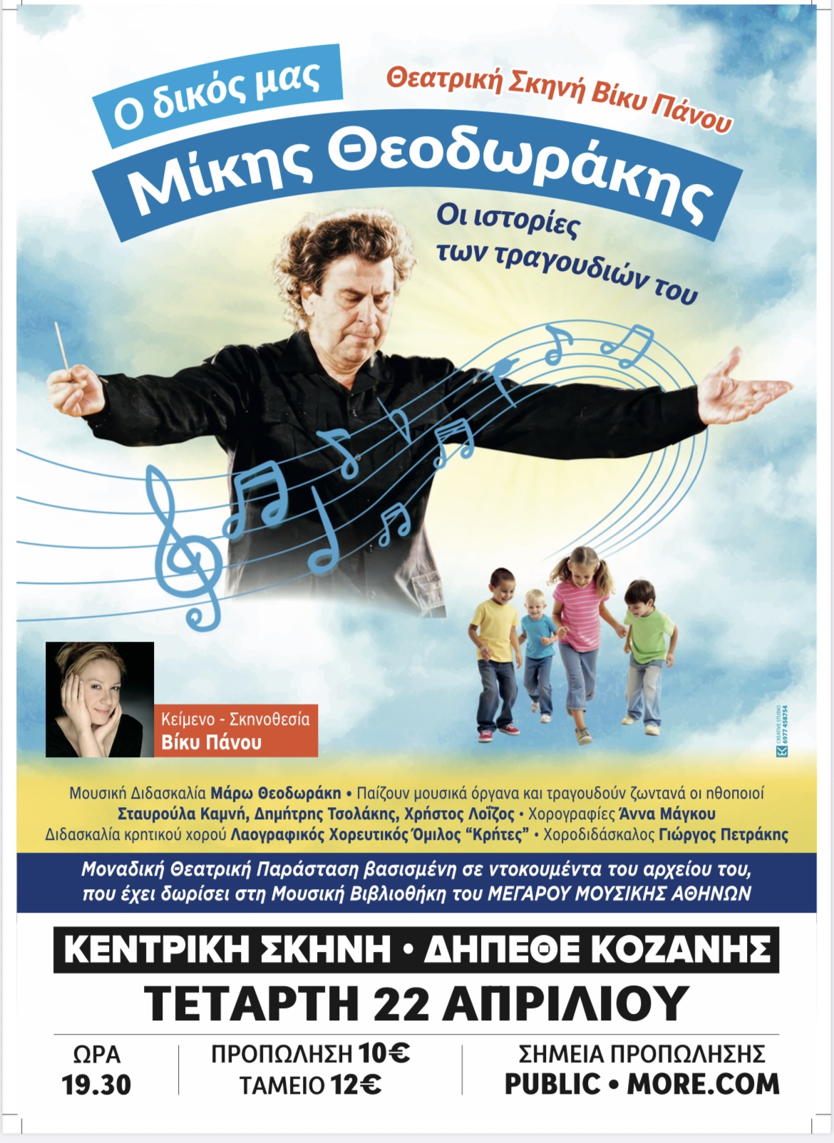 Φέτος με αφορμή το Έτος Μίκη Θεοδωράκη (100 χρόνια από τη γέννησή του), έχω την τιμή και τη χαρά να μου έχει αναθέσει το Μέγαρο Μουσικής Αθηνών την δημιουργία μιας θεατρικής παράστασης βασισμένης στο πολύτιμο αρχείο του Μίκη Θεοδωράκη. Σε μία ένδειξη αγάπης του προς την πατρίδα, χαρίζει όλο του το αρχείο στην Μουσική Βιβλιοθήκη του Μεγάρου Μουσικής Αθηνών, ώστε να είναι προσβάσιμο σε όλους και φέτος ανοίγει για πρώτη φορά στα παιδιά!