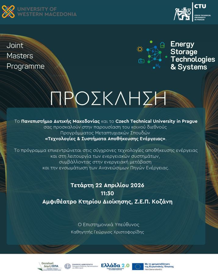 Παρουσιάζεται την Τετάρτη 22 Απριλίου 2026, στις 11:30, στο Αμφιθέατρο του Κτιρίου Διοίκησης στη ΖΕΠ Κοζάνης, το νέο Κοινό Διεθνές Πρόγραμμα Μεταπτυχιακών Σπουδών «Τεχνολογίες και Συστήματα Αποθήκευσης Ενέργειας», που υλοποιείται από το Πανεπιστήμιο Δυτικής Μακεδονίας σε συνεργασία με το Czech Technical University in Prague (CTU).