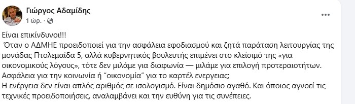 Είναι επικίνδυνοι! Όταν ο ΑΔΜΗΕ προειδοποιεί για την ασφάλεια εφοδιασμού και ζητά παράταση λειτουργίας της μονάδας Πτολεμαΐδα 5, αλλά κυβερνητικός βουλευτής επιμένει στο κλείσιμό της «για οικονομικούς λόγους», τότε δεν μιλάμε για διαφωνία — μιλάμε για επιλογή προτεραιοτήτων.