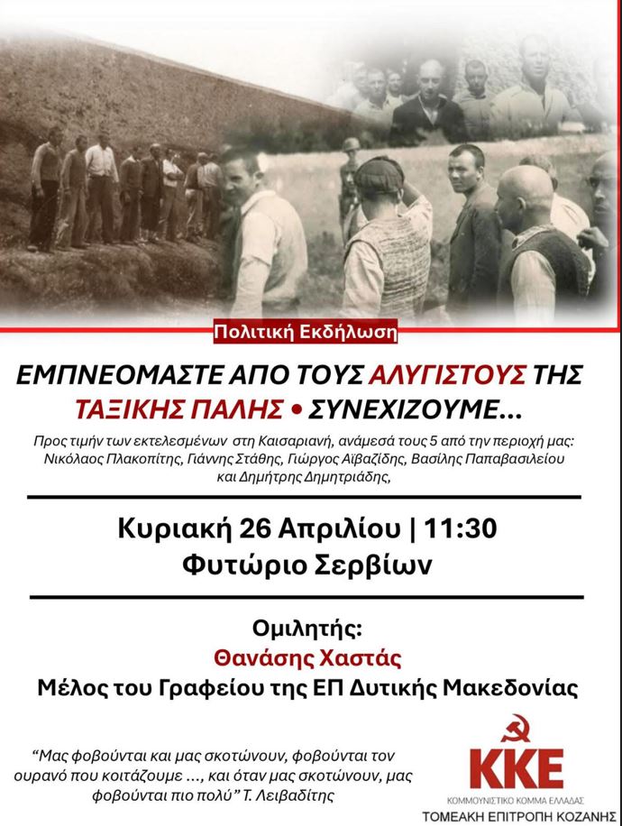 Κυριακή 26 Απριλίου 11:30πμ Φυτώριο Σερβίων. Ομιλητής Θανάσης Χαστάς μέλος του Γραφείου της Επιτροπής Περιοχής Δυτικής Μακεδονίας του ΚΚΕ.