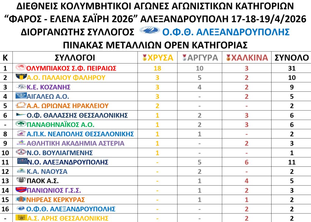 Οι επιτυχίες συνεχίζονται για την Κολυμβητική Ένωση Κοζάνης, καθώς οι αθλητές και οι αθλήτριές μας πραγματοποίησαν εξαιρετική εμφάνιση στο Διεθνές Μίτινγκ «Φάρος – Έλενα Σαΐρη», που διεξήχθη στην Αλεξανδρούπολη, κατακτώντας συνολικά 13 μετάλλια.