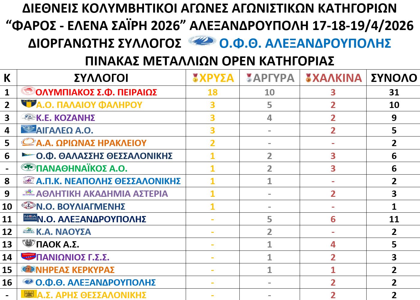 Αναλυτικά τα μετάλλια: