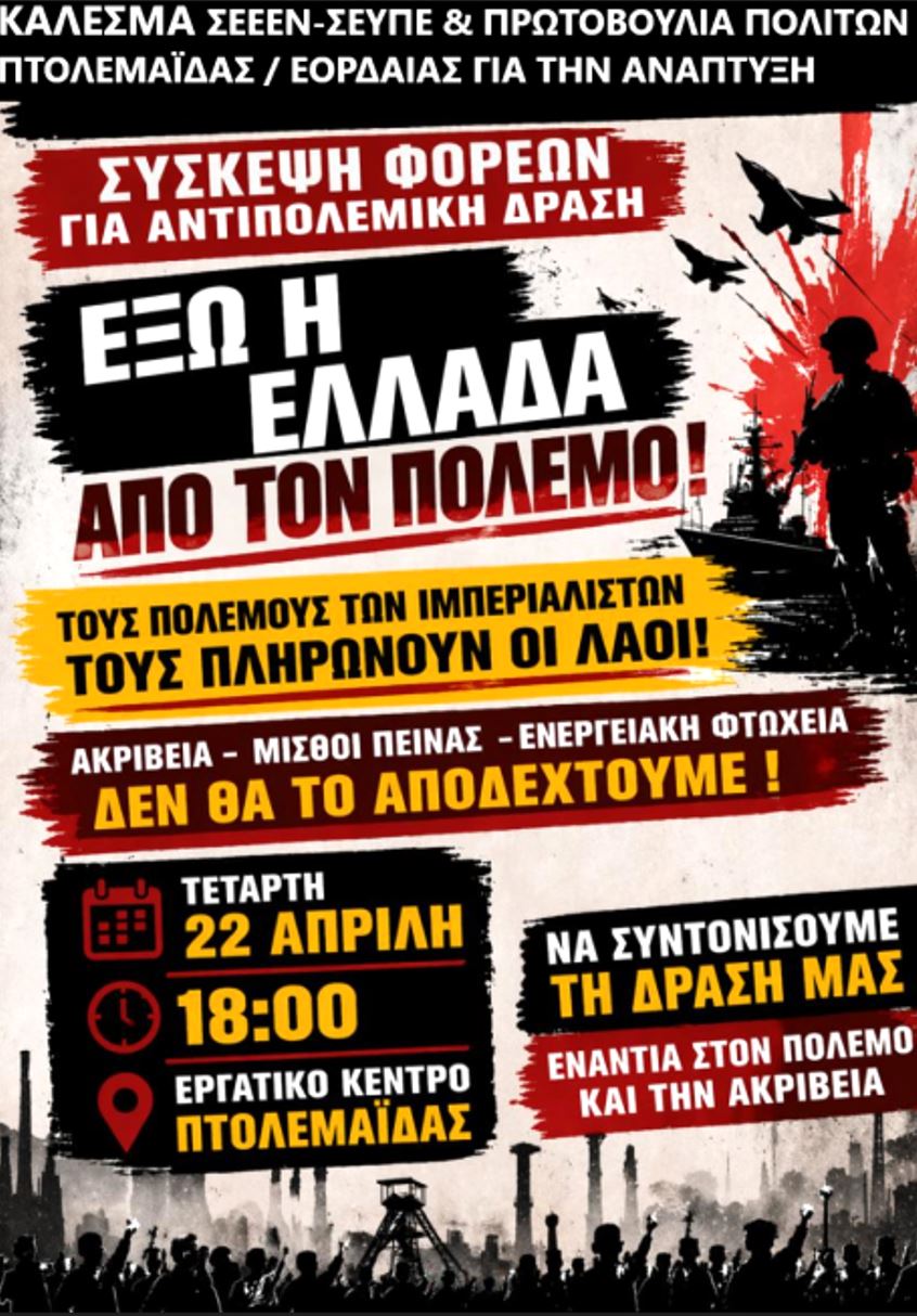 Την Τετάρτη 22 Απρίλη του 2026 στις 18:00 στο Εργατικό Κέντρο Πτολεμαΐδας τα σωματεία ΣΕΕΕΝ, ΣΕΥΠΕ και η ΠΡΩΤΟΒΟΥΛΙΑ ΠΟΛΙΤΩΝ ΠΤΟΛΕΜΑΪΔΑΣ / ΕΟΡΔΑΙΑΣ ΓΙΑ ΤΗΝ ΑΝΑΠΤΥΞΗ, καλούν τα σωματεία, τους συλλόγους, τους φορείς της Εορδαίας, αλλά και όλους τους εργαζόμενους, συνταξιούχους και ανέργους της περιοχής σε μια σύσκεψη, με κύρια θέματα, αντίδραση κατά των πολέμων αλλά και αντίσταση κατά της ακρίβειας.