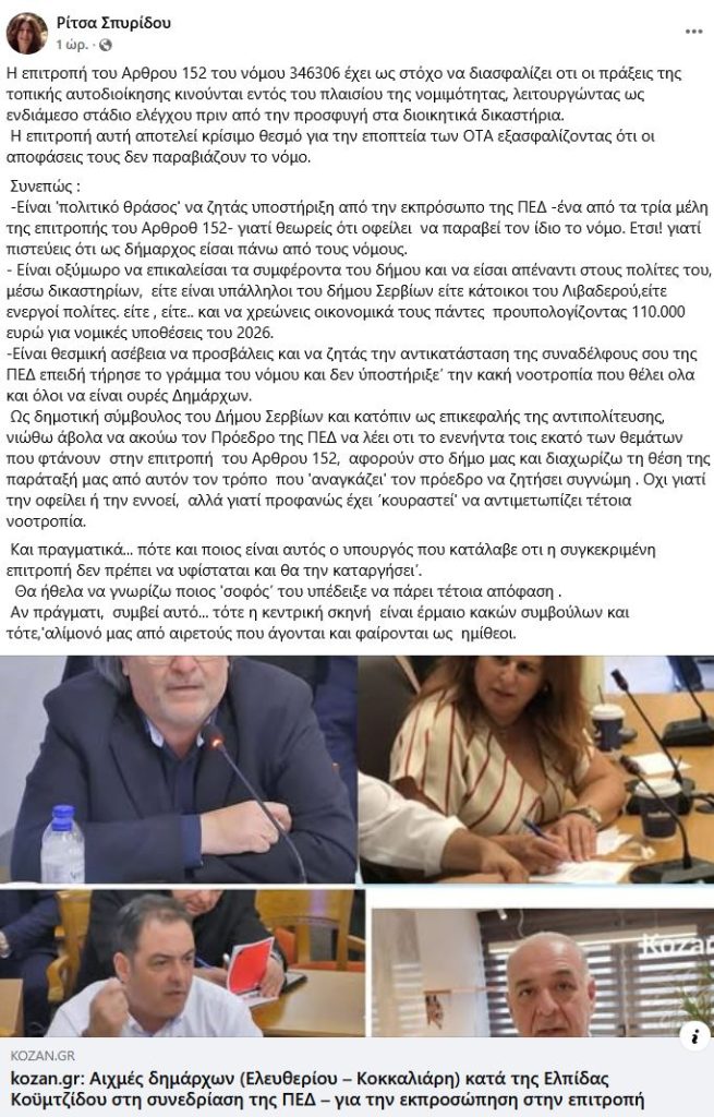Ως δημοτική σύμβουλος του Δήμου Σερβίων και κατόπιν ως επικεφαλής της αντιπολίτευσης, νιώθω άβολα να ακούω τον Πρόεδρο της ΠΕΔ να λέει οτι το ενενήντα τοις εκατό των θεμάτων που φτάνουν στην επιτροπή του Αρθρου 152, αφορούν στο δήμο μας και διαχωρίζω τη θέση της παράταξή μας από αυτόν τον τρόπο που ‘αναγκάζει’ τον πρόεδρο να ζητήσει συγνώμη . Οχι γιατί την οφείλει ή την εννοεί, αλλά γιατί προφανώς έχει ΄κουραστεί’ να αντιμετωπίζει τέτοια νοοτροπία.