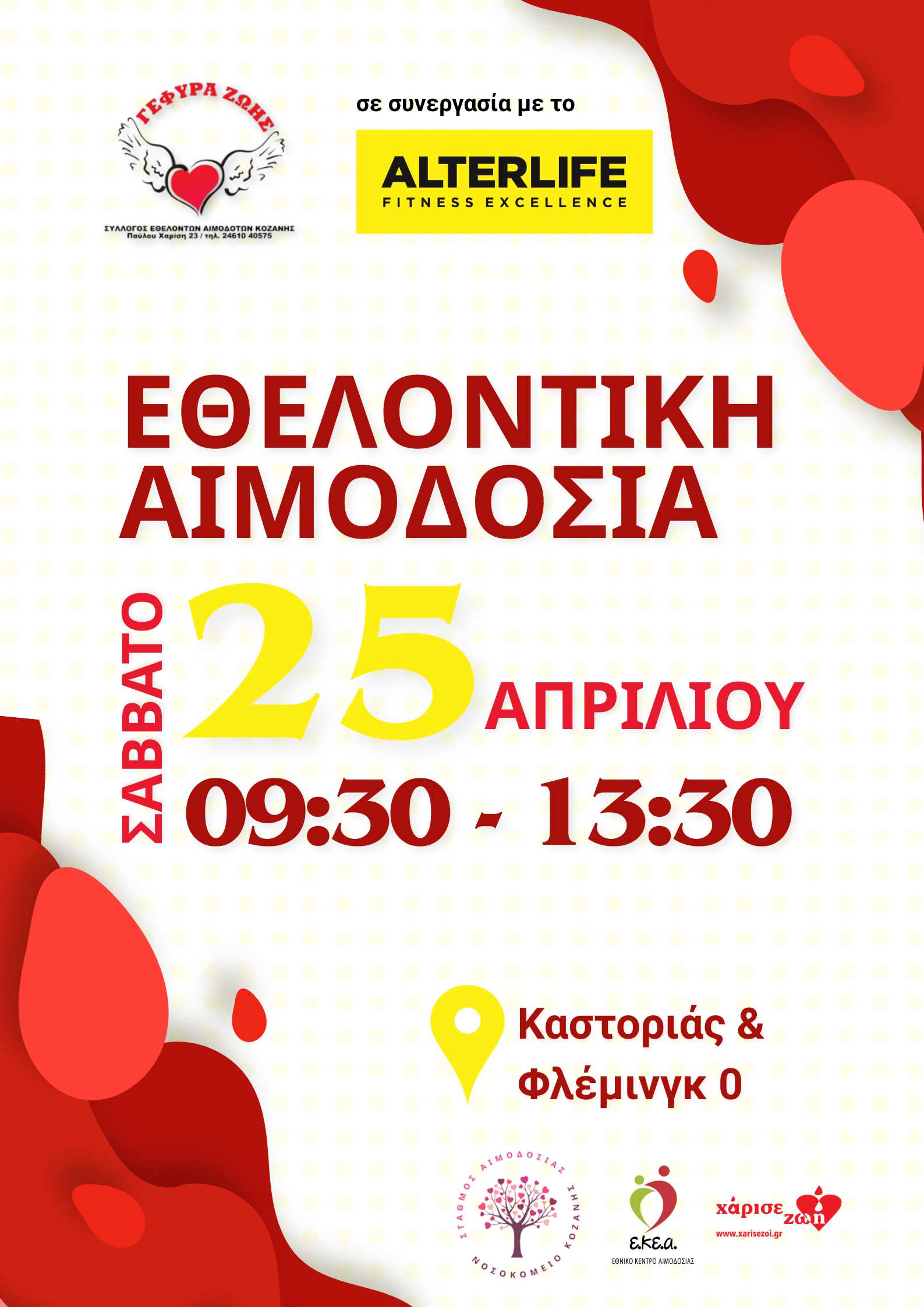Το Σάββατο 25 Απριλίου, από τις 09:30 έως τις 13:30, σας περιμένουμε στον χώρο του γυμναστηρίου ALTERLIFE (ΚΑΣΤΟΡΙΑΣ & Φλέμινγκ 0, Κοζάνη), για να συμμετάσχετε σε αυτή την πράξη προσφοράς ζωής.