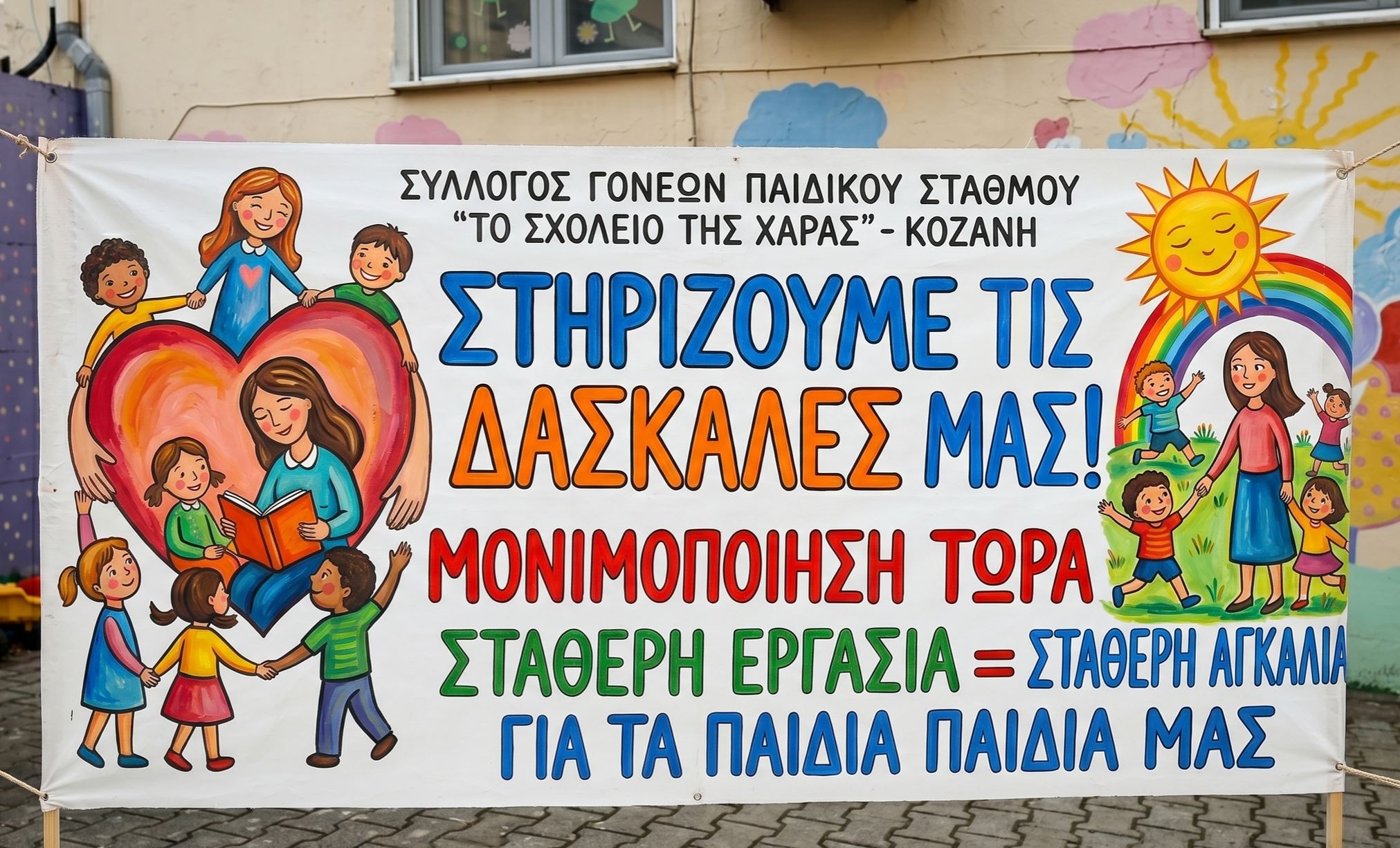 Ως γονείς των παιδιών που φοιτούν στον Παιδικό Σταθμό «Το Σχολείο της Χαράς» στην Κοζάνη, αισθανόμαστε την ηθική και κοινωνική υποχρέωση να υψώσουμε τη φωνή μας δίπλα στις δασκάλες μας.