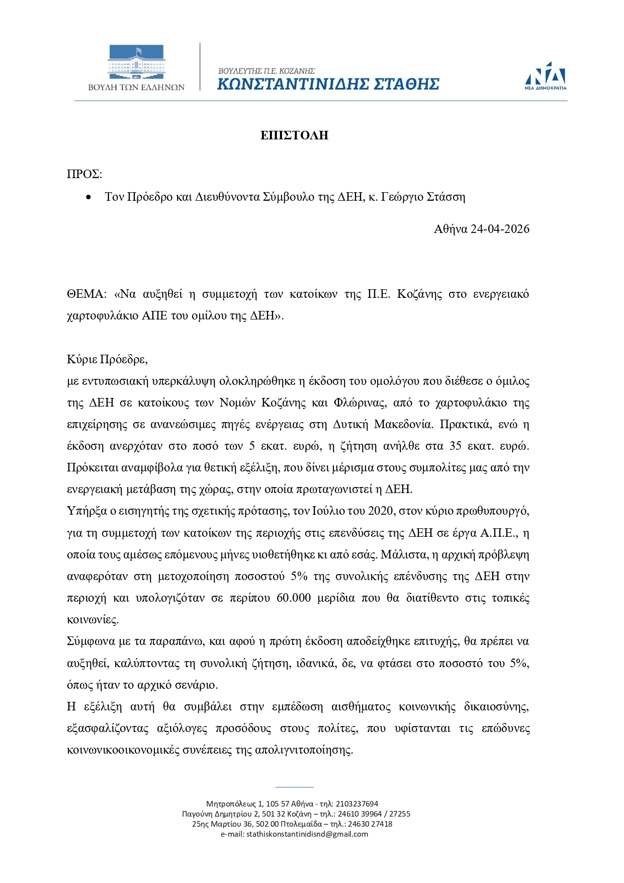 Τον Ιούλιο του 2020, σε συνάντηση των βουλευτών της περιοχής με τον πρωθυπουργό Κυριάκο Μητσοτάκη, υπήρξα ο εισηγητής πρότασης με τίτλο «Να γίνουμε εταίροι στο ενεργειακό μας μέλλον», που αφορούσε στη συμμετοχή των κατοίκων της περιοχής στις επενδύσεις της ΔΕΗ σε έργα Α.Π.Ε., η οποία σύντομα υιοθετήθηκε κι από τον Πρόεδρο και Διευθύνοντα Σύμβουλο της επιχείρησης κ. Στάσση. Μάλιστα, η αρχική πρόβλεψη αναφερόταν στη μετοχοποίηση ποσοστού 5% της συνολικής επένδυσης και υπολογιζόταν σε περίπου 60.000 μερίδια που θα διατίθεντο στις τοπικές κοινωνίες.