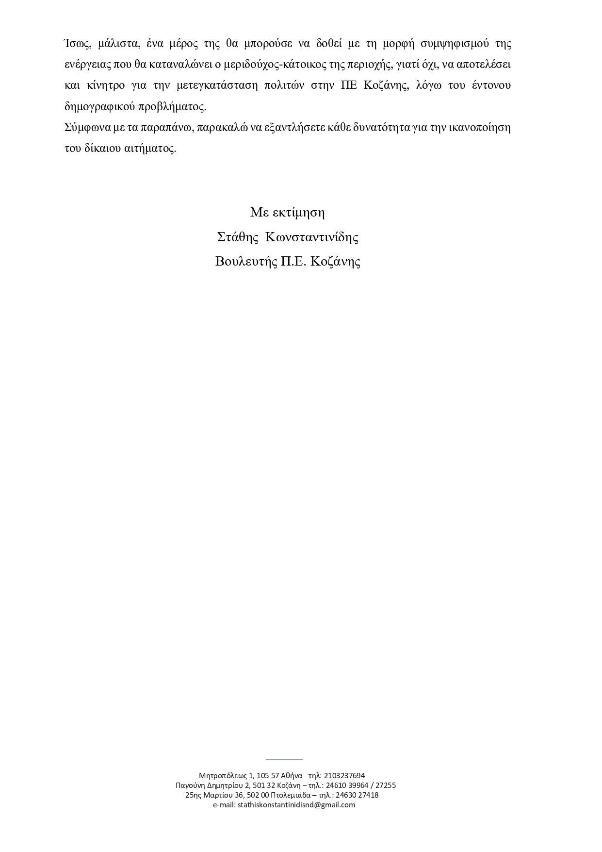 Σημείωσα, δε, ότι μία τέτοια εξέλιξη θα συμβάλει στην εμπέδωση αισθήματος κοινωνικής δικαιοσύνης, εξασφαλίζοντας αξιόλογες προσόδους στους πολίτες της περιοχής, που υφίστανται τις επώδυνες κοινωνικοοικονομικές συνέπειες της απολιγνιτοποίησης.