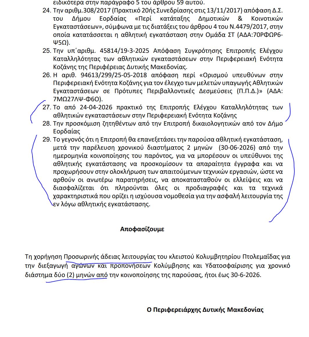 Σύμφωνα με πληροφορίες του kozan.gr, που παρουσιάζει το θέμα, σημαντική εξέλιξη για το Κλειστό Κολυμβητήριο Πτολεμαΐδας, καθώς, σύμφωνα με αποφάσεις της Περιφέρειας Δυτικής Μακεδονίας, χορηγήθηκε προσωρινή άδεια λειτουργίας διάρκειας δύο μηνών, έως τις 30 Ιουνίου 2026, προκειμένου να φιλοξενηθούν προπονήσεις αλλά και επίσημες διοργανώσεις κολύμβησης και υδατοσφαίρισης.
