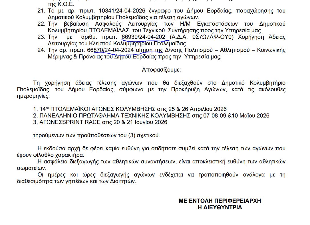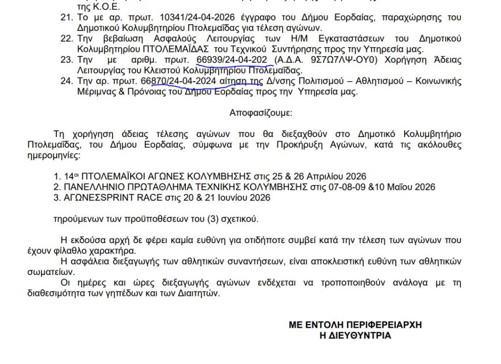 Παράλληλα, εγκρίθηκε και η άδεια διεξαγωγής σημαντικών αγώνων που θα πραγματοποιηθούν στο Δημοτικό Κολυμβητήριο Πτολεμαΐδας, με διοργανώτρια την Αθλητική Κολυμβητική Ακαδημία «Δελφίνια Πτολεμαΐδας».