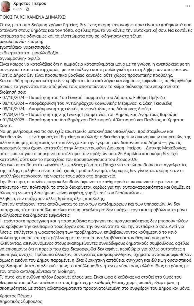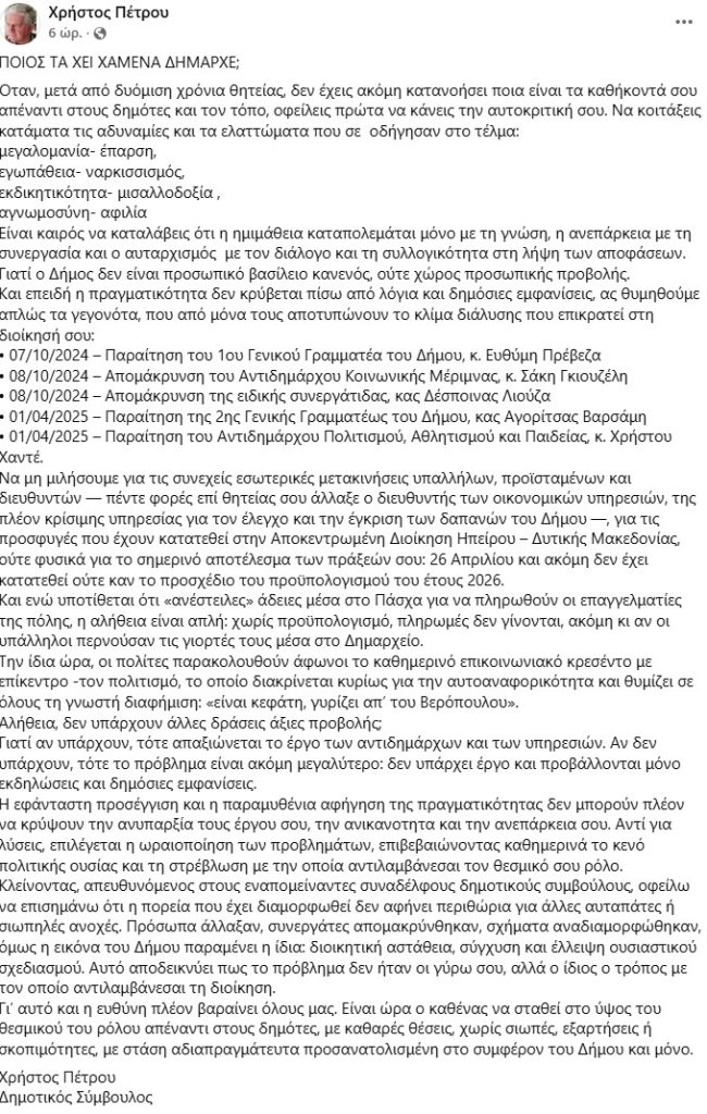 Με μια ιδιαίτερα αιχμηρή και προσωπικού χαρακτήρα ανακοίνωση, ο πρώην αντιδήμαρχος Γρεβενών, πρώην δήμαρχος Θεόδωρου Ζιάκα και νυν δημοτικός σύμβουλος της συμπολίτευσης, Χρήστος Πέτρου, εξαπολύει σφοδρή επίθεση προς τον δήμαρχο Γρεβενών, Κυριάκο Ταταρίδη κάνοντας λόγο για διοικητική αστάθεια, έλλειψη σχεδιασμού και σοβαρές δυσλειτουργίες στη λειτουργία του Δήμου. Στην παρέμβασή του, ο κ. Χρήστος Πέτρου καταγράφει παραιτήσεις στελεχών, απομακρύνσεις συνεργατών, καθυστερήσεις στον προϋπολογισμό και κάνει λόγο για ένα κλίμα εσωτερικής αποσύνθεσης, καλώντας παράλληλα τους υπόλοιπους δημοτικούς συμβούλους να πάρουν ξεκάθαρη θέση.