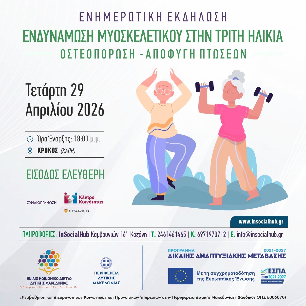 Ενημερωτική εκδήλωση με θέμα «Ενδυνάμωση μυοσκελετικού στην τρίτη ηλικία – Οστεοπόρωση – Αποφυγή πτώσεων» θα πραγματοποιηθεί την Τετάρτη 29 Απριλίου 2026 στον Κρόκο Κοζάνης.