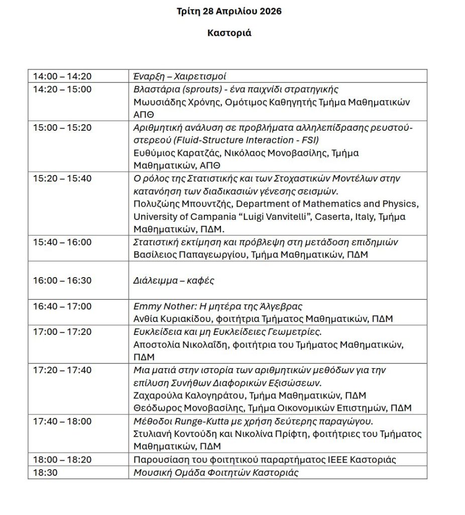 Η διοργάνωση πραγματοποιείται από τις 22 έως τις 28 Απριλίου 2026 από την Ελληνική Μαθηματική Εταιρεία και τα παραρτήματά της. Οι εκδηλώσεις στην Καστοριά, που συνδιοργανώνονται από το Παράρτημα Καστοριάς της Ελληνικής Μαθηματικής Εταιρείας και το Τμήμα Μαθηματικών του Πανεπιστημίου Δυτικής Μακεδονίας, θα πραγματοποιηθούν την Τρίτη 28 Απριλίου 2026, στην Πανεπιστημιούπολη Καστοριάς, από τις 14:00 έως τις 18:30, με τη συμμετοχή μελών ΔΕΠ και φοιτητών/τριών, σε ένα πρόγραμμα που συνδέει τη θεωρία με σύγχρονες εφαρμογές.