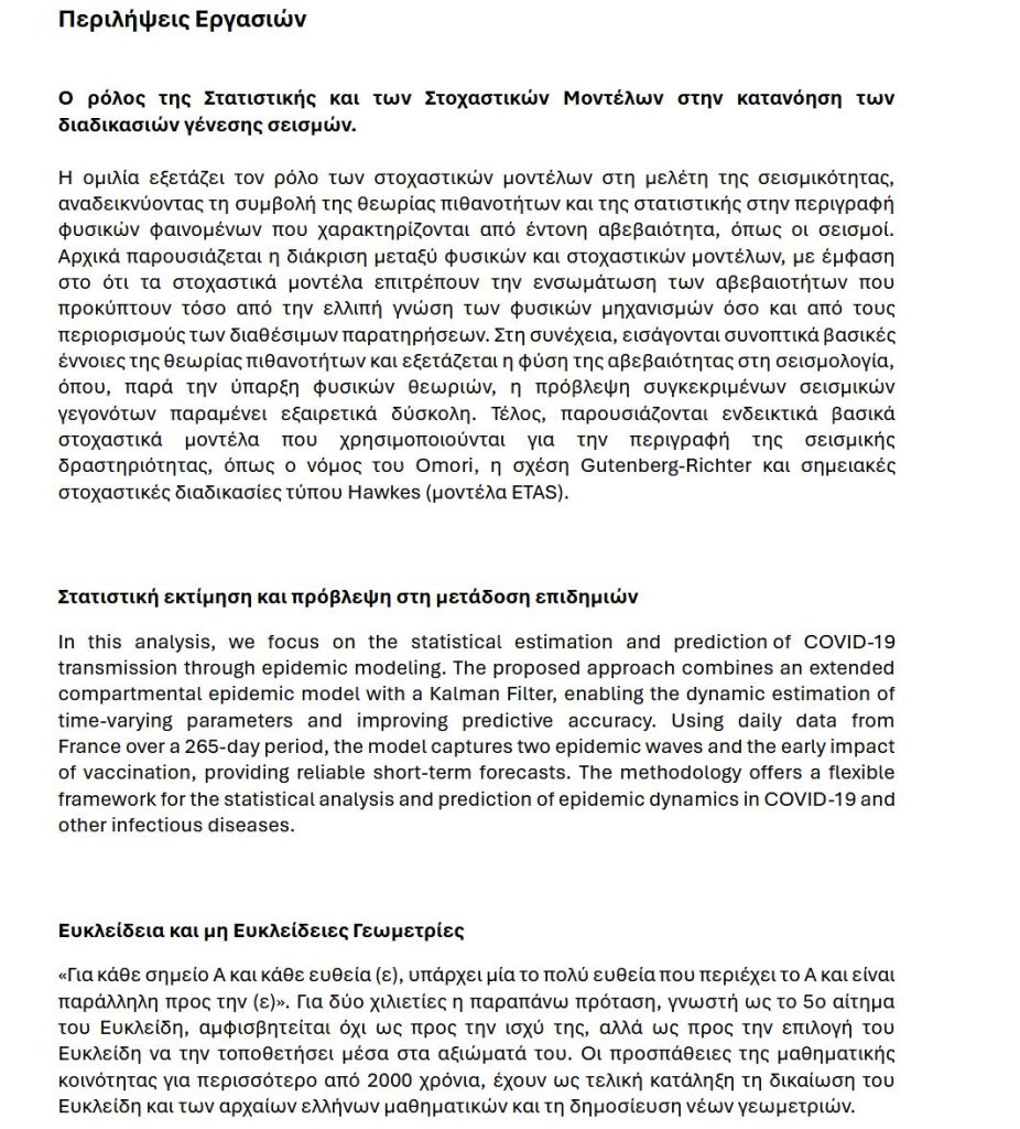 • τη συμβολή της Στατιστικής και των στοχαστικών μοντέλων στην κατανόηση φυσικών φαινομένων, όπως οι σεισμοί,