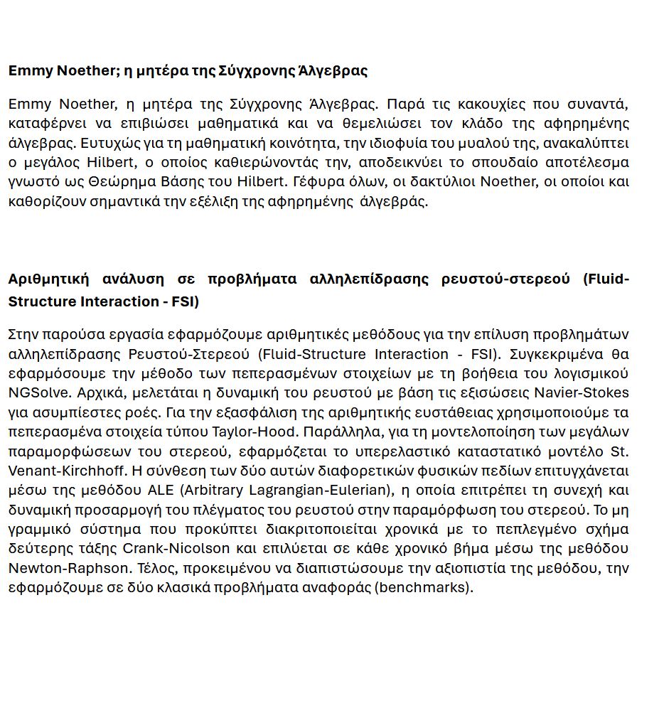 • καθώς και ζητήματα ιστορίας και φιλοσοφίας των Μαθηματικών, όπως οι μη Ευκλείδειες γεωμετρίες και το έργο της Emmy Noether.