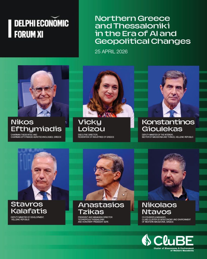 Το CluBE – Cluster of Bioeconomy and Environment of Western Macedonia συμμετείχε δυναμικά στο Delphi Economic Forum XI, επιβεβαιώνοντας τον ενεργό του ρόλο στην προώθηση της βιώσιμης ανάπτυξης, της καινοτομίας και του ψηφιακού μετασχηματισμού. Το διεθνούς κύρους οικονομικό και πολιτικό συνέδριο πραγματοποιήθηκε στους Δελφούς από τις 22 έως τις 25 Απριλίου 2026, συγκεντρώνοντας εκπροσώπους της πολιτικής, της επιχειρηματικότητας και του οικοσυστήματος καινοτομίας.