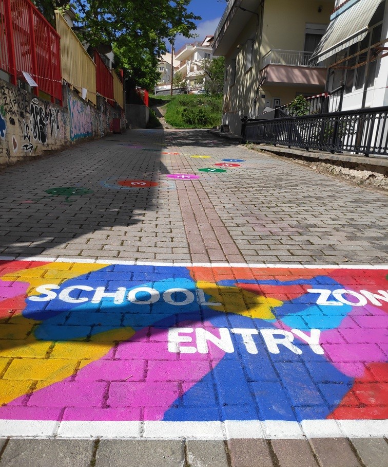 Η παρέμβαση, που πραγματοποιήθηκε υπό την ομπρέλα του ευρωπαϊκού προγράμματος JUST STREETS, ένωσε τη σχολική κοινότητα με την τέχνη, προωθώντας τη βιώσιμη κινητικότητα και την προσεκτική χρήση του δρόμου.