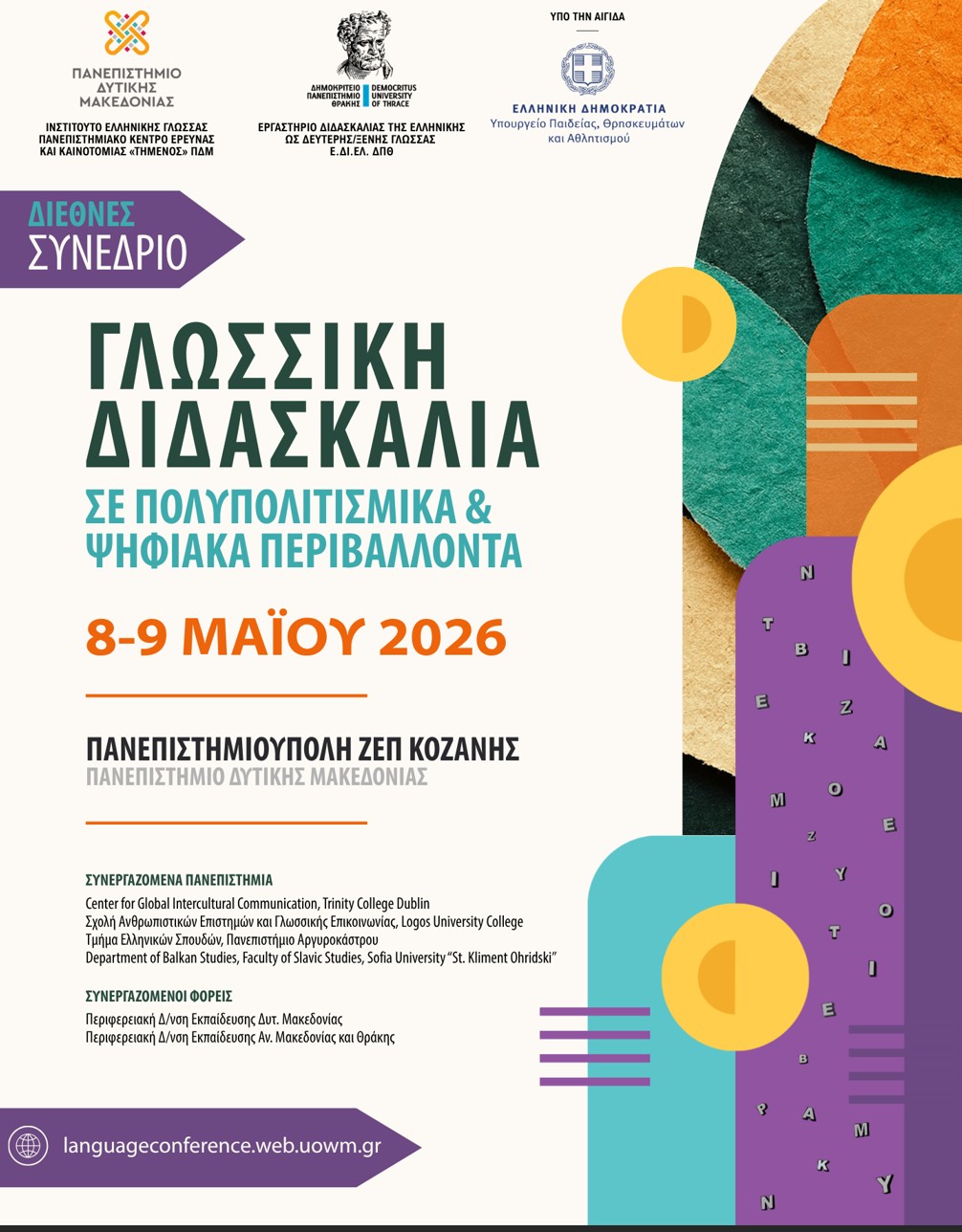 Το Πανεπιστήμιο Δυτικής Μακεδονίας και το Δημοκρίτειο Πανεπιστήμιο Θράκης διοργανώνουν Διεθνές Συνέδριο με τίτλο «Γλωσσική Διδασκαλία σε Πολυπολιτισμικά και Ψηφιακά Περιβάλλοντα», το οποίο θα πραγματοποιηθεί στις 8 και 9 Μαΐου 2026 στην Πανεπιστημιούπολη ΖΕΠ Κοζάνης υπό την αιγίδα του Υπουργείου Παιδείας, Θρησκευμάτων και Αθλητισμού.