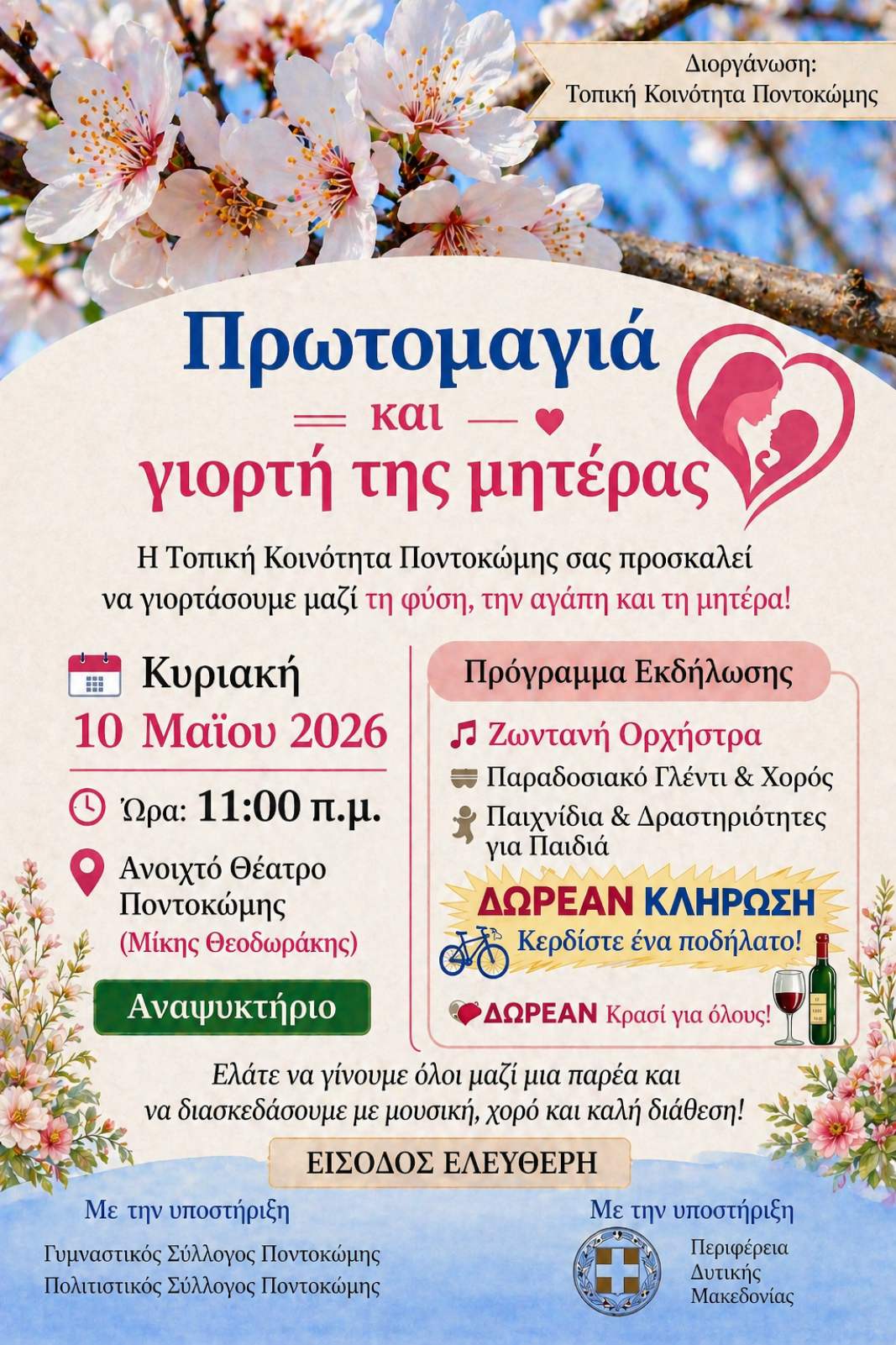 Λόγω των δυσμενών καιρικών συνθηκών που προβλέπονται για την Πρωτομαγιά, η προγραμματισμένη εκδήλωση στην Ποντοκώμη μεταφέρεται την Κυριακή 10 Μαΐου, ( ΓΙΟΡΤΗ ΤΗΣ ΜΗΤΕΡΑΣ).