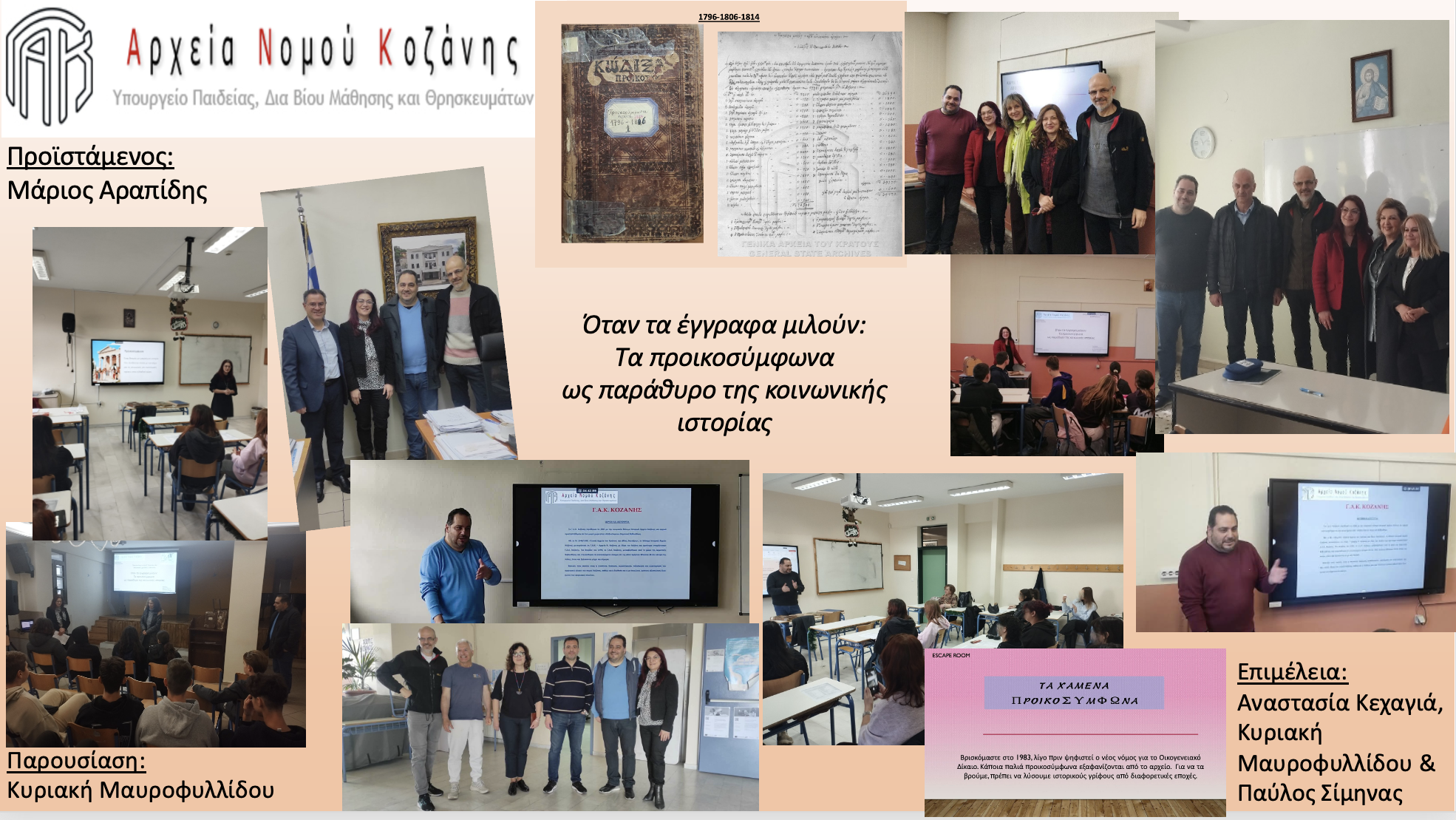 Οι σχολικές αίθουσες μεταμορφώθηκαν σε ζωντανούς χώρους ιστορικής ανακάλυψης, όπου η εκπαιδευτική ομάδα των ΓΑΚ, αποτελούμενη από τον προϊστάμενο της υπηρεσίας Μάριο Αραπίδη, τη φιλόλογο Κυριακή Μαυροφυλλίδου και τον εκπαιδευτικό Παύλο Σίμηνα, οδήγησε τους μαθητές σε μια συναρπαστική περιήγηση στον κόσμο του παρελθόντος, αξιοποιώντας αυθεντικά αρχειακά τεκμήρια. Παρουσιάστηκαν μοναδικά προικοσύμφωνα από τα Αρχεία του Νομού Κοζάνης, χειρόγραφα ηλικίας έως και 200 ετών, που φωτίζουν με ζωντάνια την καθημερινότητα και τα κοινωνικά έθιμα παλαιότερων εποχών. Τα προικοσύμφωνα αυτά προέρχονται από το αρχείο του Κοζανίτη συμβολαιογράφου Πράσσου, φυλάσσονται στα ΓΑΚ Κοζάνης και είναι πλέον και ψηφιοποιημένα, γεγονός που ενισχύει τη διατήρηση και την ευρύτερη πρόσβασή τους.